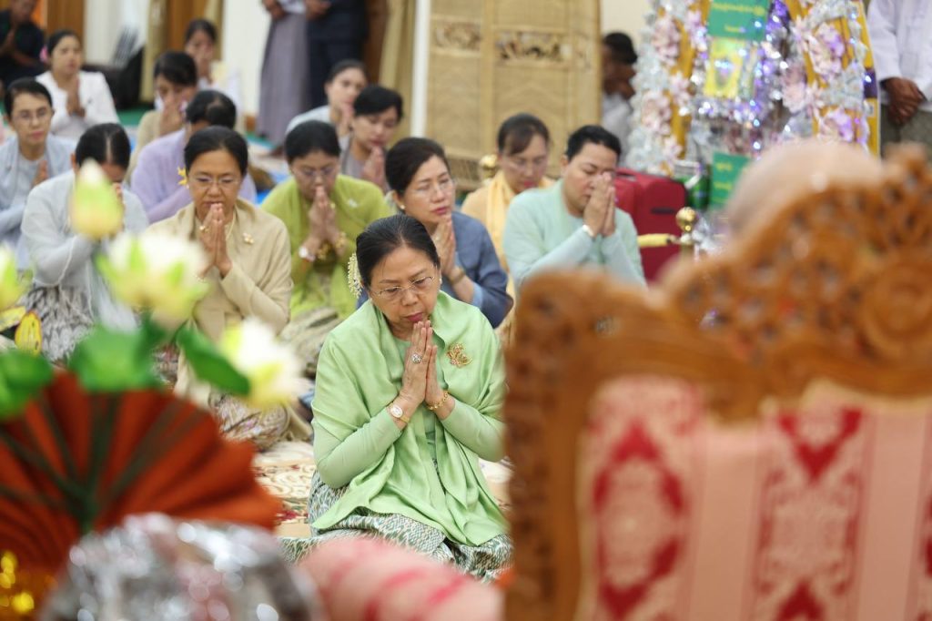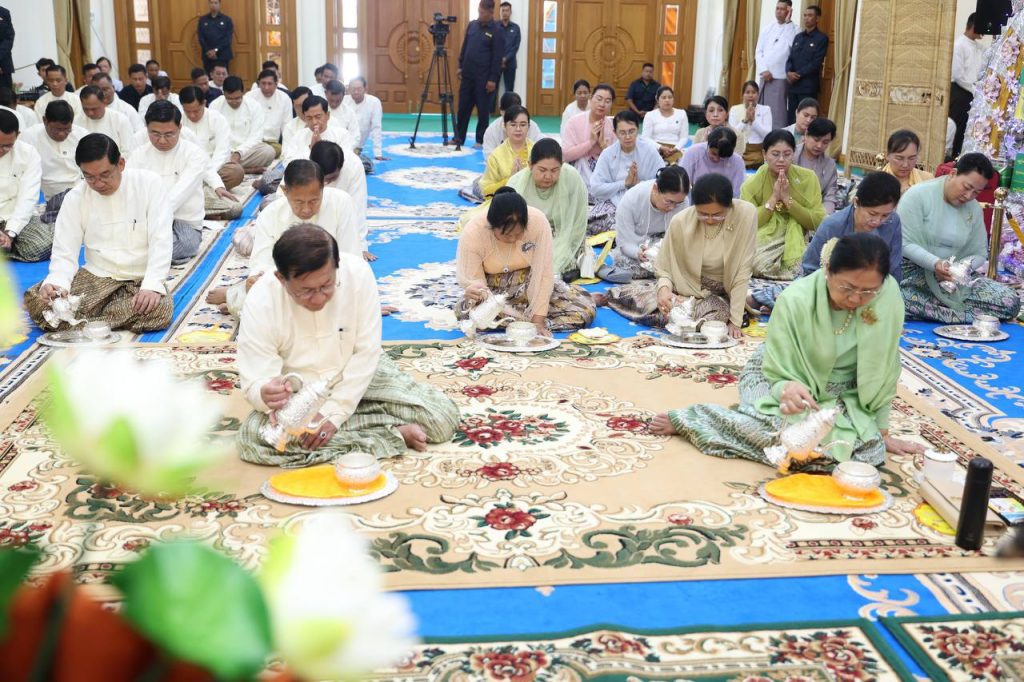 ယာယီသမ္မတက မာရဝိဇယကျောင်းဆောင်တော်အတွင်းရှိ ဗုဒ္ဓရုပ်ပွားတော်မြတ်အား မြသပိတ်ဆွမ်းတော်၊ သစ်သီးနှင့် ပန်းမန်၊ သောက်တော်ရေချမ်းများ ကပ်လှူပူဇော်ပြီးနောက် အခမ်းအနားကို “နမောတဿ” သုံးကြိမ်ရွတ်ဆို ဘုရားကန်တော့ ဖွင့်လှစ်ပြီး ယာယီသမ္မတနှင့် အခမ်းအနား တက်ရောက်လာကြသည့် ဧည့်ပရိသတ်အပေါင်းတို့သည် မာရဝိဇယကျောင်းတော် ပဓာနနာယက အဂ္ဂမဟာပဏ္ဍိတ ဘဒ္ဒန္တနေမိန္ဒထံမှ ငါးပါးသီလခံယူ ဆောက်တည်၍ သံဃာတော်အရှင်သူမြတ်များ ရွတ်ပွားသရဇ္ဈာယ်တော်မူသော မေတ္တသုတ် ပရိတ်တရားတော်များကို နာယူကြသည်။