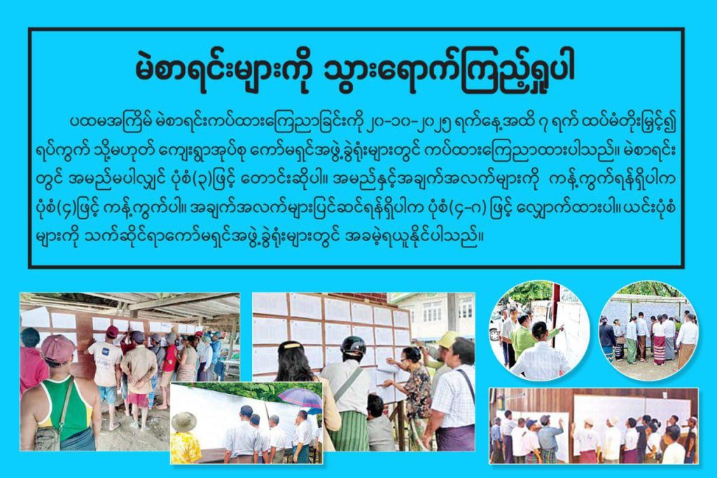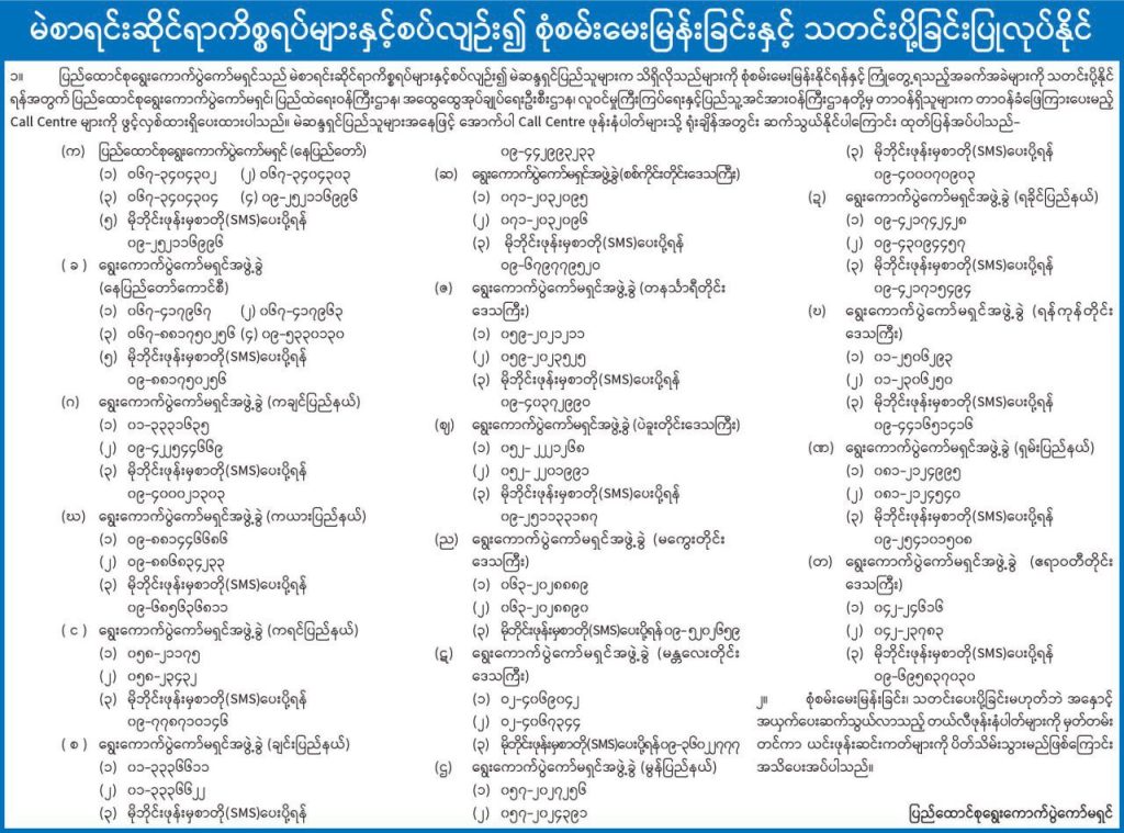 ထို့ပြင် ပြည်ထဲရေးဝန်ကြီးဌာန၊ အထွေထွေအုပ်ချုပ်ရေးဦးစီးဌာနအနေဖြင့် မဲစာရင်းဆိုင်ရာ ကိစ္စရပ်များအား စုံစမ်းမေးမြန်းနိုင်ရန် Call Center များ ဖွင့်လှစ်၍ ပြည်ထောင်စု ရွေးကောက်ပွဲကော်မရှင်၊ လူဝင်မှုကြီးကြပ်ရေးနှင့် ပြည်သူ့အင်အားဝန်ကြီးဌာနတို့နှင့် ပူးပေါင်းကာ မဲဆန္ဒရှင်ပြည်သူများ၏ ဆက်သွယ်မေးမြန်းမှု ၇၃၂ ကြိမ် ဖြေရှင်းကူညီ ဆောင်ရွက်ပေးခဲ့ပြီး မဲစာရင်းပြည့်စုံမှန်ကန်စေရေးနှင့် မဲစာရင်းကျန်ရှိမှုမရှိစေရေး မြေပြင်ကွင်းဆင်းစစ်ဆေးခြင်း ၂၈၃၇၅ ကြိမ်၊ လှည့်လည်နှိုးဆော်ခြင်း ၄၅၂၄၈ ကြိမ်၊ OSS ဖြင့်ဆောင်ရွက်ပေးခြင်း ၂၈၂၅၉၂ ကြိမ်ကို သက်ဆိုင်ရာဌာနများနှင့် ပူးပေါင်းဆောင်ရွက်နိုင်ခဲ့ကြောင်း၊ ထို့အပြင် ပြည်ထောင်စုရွေးကောက်ပွဲကော်မရှင်မှ ထုတ်ပြန်ကြေညာခဲ့သည့် မဲစာရင်းတွင်ပါရှိပြီး သက်ဆိုင်ရာမြို့နယ်၏ ပြင်ပတွင်ရောက်ရှိနေသော ဆန္ဒမဲပေးပိုင်ခွင့်ရှိသူများ၊ ယာယီနေရပ်စွန့်ခွာနေရသူများနှင့် ရဲစခန်းအချုပ်၊ အချုပ်ထောင်၊ အကျဉ်းထောင်များ၌ အကြောင်းအမျိုးမျိုးကြောင့် ပြစ်မှုရင်ဆိုင်ဖြေရှင်းနေရသည့် အချုပ်သားများအား ကြိုတင်ဆန္ဒမဲပေးနိုင်ရေးအတွက် သက်ဆိုင်ရာရွေးကောက်ပွဲကော်မရှင်အဖွဲ့ခွဲများနှင့် ကြိုတင်ပေါင်းစပ်ညှိနှိုင်း၍ဆောင်ရွက်သွားကြရန် လိုအပ်ကြောင်း၊ ရွေးကောက်ပွဲကာလတွင် လာရောက်လေ့လာကြမည့် ပြည်တွင်းပြည်ပလေ့လာရေးအဖွဲ့များ၊ မီဒီယာများနှင့် ပတ်သက်၍လည်း လိုအပ်သည့်လုံခြုံရေးဆိုင်ရာကိစ္စရပ်များကို သေချာစွာ စီမံဆောင်ရွက်ပေးကြရမည် ဖြစ်ကြောင်းလည်း ပြည်ထောင်စုဝန်ကြီးက ပြောကြားသည်။