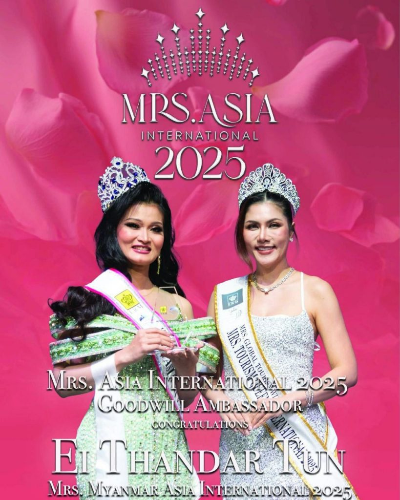 Golden Star Organization ရဲ့စီစဉ်မှုနဲ့ ထိုင်းနိုင်ငံ ဗန်ကောက်မြို့ Calypso Asiatique မှာ ကျင်းပခဲ့တဲ့ Mrs. Asia International 2025 ပြိုင်ပွဲကြီးမှာ မြန်မာနိုင်ငံကိုယ်စားပြု အလှမယ်အိသန္တာထွန်းက Mrs. Asia International 2025 Tourism Crown ဆုနဲ့အတူ Best National Costume၊ Goodwill Ambassador ဆု တို့ကို အသီးသီးရရှိခဲ့ပြီး နိုဝင်ဘာလ ၂ ရက်နေ့ ညပိုင်းက မြန်မာနိုင်ငံကိုပြန်လည်ရောက်ရှိခဲ့ပါတယ်။