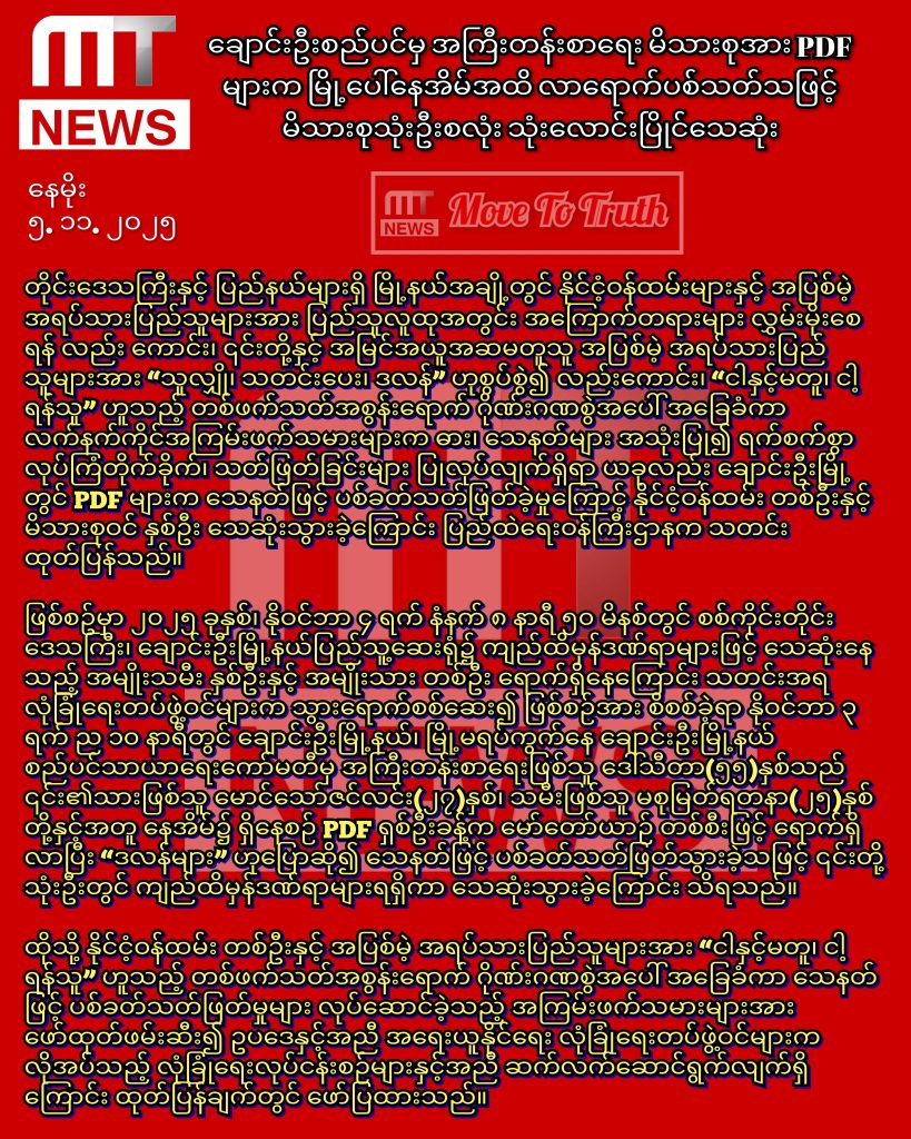တိုင်းဒေသကြီးနှင့် ပြည်နယ်များရှိ မြို့နယ်အချို့တွင် နိုင်ငံ့ဝန်ထမ်းများနှင့် အပြစ်မဲ့ အရပ်သားပြည်သူများအား ပြည်သူလူထုအတွင်း အကြောက်တရားများ လွှမ်းမိုးစေရန် လည်း ကောင်း၊ ၎င်းတို့နှင့် အမြင်အယူအဆမတူသူ အပြစ်မဲ့ အရပ်သားပြည်သူများအား “သူလျှို၊ သတင်းပေး၊ ဒလန်” ဟုစွပ်စွဲ၍ လည်းကောင်း၊ “ငါနှင့်မတူ၊ ငါ့ရန်သူ” ဟူသည့် တစ်ဖက်သတ်အစွန်းရောက် ဂိုဏ်းဂဏစွဲအပေါ် အခြေခံကာ လက်နက်ကိုင်အကြမ်းဖက်သမားများက ဓား၊ သေနတ်များ အသုံးပြု၍ ရက်စက်စွာ လုပ်ကြံတိုက်ခိုက်၊ သတ်ဖြတ်ခြင်းများ ပြုလုပ်လျက်ရှိရာ ယခုလည်း ချောင်းဦးမြို့တွင် PDF များက သေနတ်ဖြင့် ပစ်ခတ်သတ်ဖြတ်ခဲ့မှုကြောင့် နိုင်ငံ့ဝန်ထမ်း တစ်ဦးနှင့် မိသားစုဝင် နှစ်ဦး သေဆုံးသွားခဲ့ကြောင်း ပြည်ထဲရေးဝန်ကြီးဌာနက ယခုည သတင်းထုတ်ပြန်သည်။
