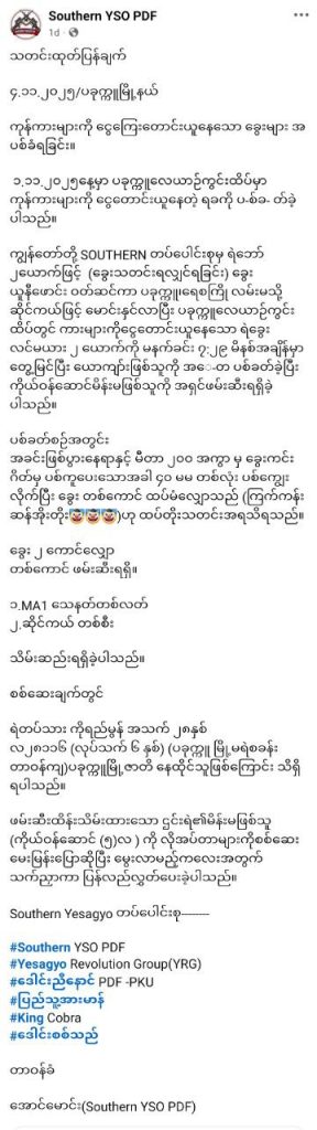 ထို့အပြင် အခင်းဖြစ်ပွားနေရာနှင့် မီတာ ၂၀၀ အကွာမှ ကင်းဂိတ်မှ ပစ်ကူပေးသောအခါ ၄၀ မမ တစ်လုံး ပစ်ခတ်လိုက်ကြောင်းနှင့် Southern YSO PDF ပစ်သတ်လိုက်သူမှာ အသက် ၂၈ နှစ်အရွယ် ရဲတပ်သား ကိုရည်မွန် (လ-၂၈၁၁၆) လုပ်သက် ၆ နှစ်၊ ပခုက္ကူ မြို့မရဲစခန်း တာဝန်ကျသည့် ပခုက္ကူမြို့ဇာတိ နေထိုင်သူဖြစ်ကြောင်း၊ ထိုဖြစ်စဥ်မှ MA1 သေနတ်တစ်လက်နှင့် ဆိုင်ကယ် တစ်စီး လုယက်ခဲ့ကြောင်း ဝန်ခံထားသလိုဖမ်းဆီး ထိန်းသိမ်းထားသော ရဲတပ်သားရည်မွန်၏ ကိုယ်ဝန်ငါးလရှိသူကို စစ်ဆေးပြီး ပြန်လွှတ်ပေးခဲ့သည်ဟုလည်း ဖော်ပြထားသည်။