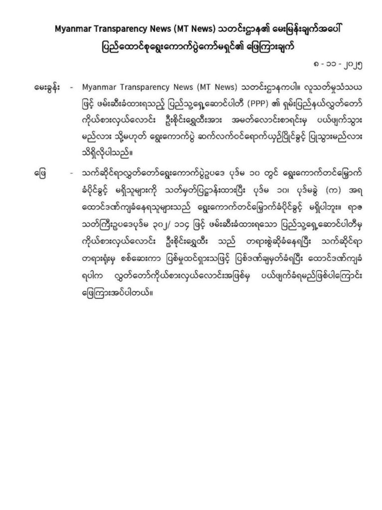 လူသတ်မှုဖြင့် ဖမ်းဆီးခံထားရသည့် PPP ပါတီ၏ ရှမ်းပြည်နယ် လွှတ်တော်ကိုယ်စားလှယ်လောင်း ဦးစိုင်းရွှေထီးအား အမတ်လောင်းစာရင်းမှ ပယ်ဖျက်သွားရန် ရှိ/မရှိနှင့် ပတ်သက်ပြီး Myanmar Transparency News (MT News) သတင်းဌာနမှ မေးမြန်းမှုအပေါ် UEC က အထက်ပါအတိုင်း ဖြေကြားခဲ့ခြင်းဖြစ်သည်။