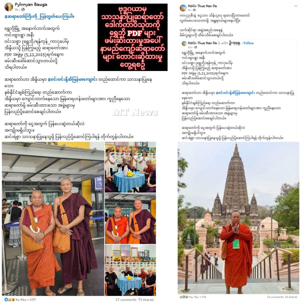 “#ဆရာတော်ကြီးကိုပြန်လွှတ်ပေးကြပါ ။ ရွှေဘိုမြို့ အနောက်ဘက်အထွက် ကင်းဗျားရွာအနီး —- (ရွှေဘို/ရန်ကုန်ကား)ပေါ်မှ အိန္ဒိယသို့ ပြန်ကြွမည့် ဆရာတော်အား PDF အဖွဲ့မှ (5.11.2025)ရက်နေ့က ဖမ်းဆီးခေါ်ဆောင်သွားတယ်လို့ သိရပါတယ်။ ဆရာတော်ဟာ အိန္ဒိယမှာ #ဝင်းဝင်းနို့ဆီမြန်မာကျောင်း တည်ထောင်ကာ သာသနာပြုနေသော နှစ်နိိုင်ငံချစ်ကြည်ရေး တည်ဆောက်ကာ အိန္ဒိယမှာ ကျောင်းတက်နေသော မြန်မာရဟန်းတော်များအား ကူညီနေသော