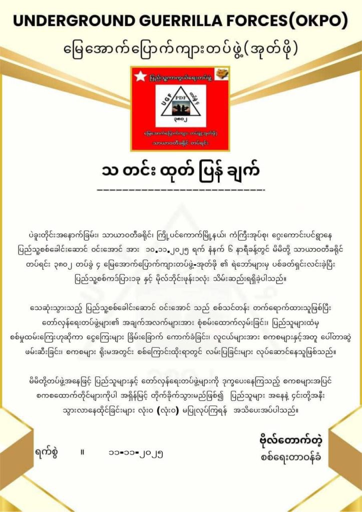 ပြည်သူ့စစ်ခေါင်းဆောင်ဟုဆိုသည့် အမျိုးသားတစ်ဦးကို .ယမန်နေ့နံနက်ပိုင်းက သေနတ်ဖြင့် ပစ်ခတ်၊ ဓားဖြင့် ခုတ်ဖြတ်ကာ ရက်စက်စွာ သတ်ဖြတ်လိုက်ကြောင်း မြေအောက်ပြောက်ကျားတပ်ဖွဲ့-အုတ်ဖိုက ယခုဝန်ခံလာသည်။