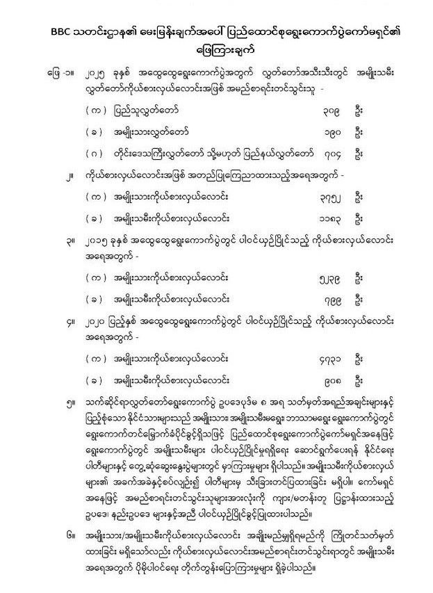 ကိုယ်စားလှယ်လောင်းအဖြစ် အတည်ပြုကြေညာထားသည့် အရေအတွက်သည် အမျိုးသားကိုယ်စားလှယ်လောင်း ၃,၇၅၂ ဦးနှင့် အမျိုးသမီးကိုယ်စားလှယ်လောင်း ၁,၁၈၃ ဦးဖြစ်ကြောင်း ဖြေကြားထားသည်။ ထို့ကြောင့် အမျိုးသမီးလွှတ်တော် ကိုယ်စားလှယ်လာင်းအဖြစ် အမည်စာရင်းတင်သွင်းသူများအနက် ၂၀ ဦးသာ ပယ်ဖျက်ခဲ့ခြင်းဖြစ်သည်။