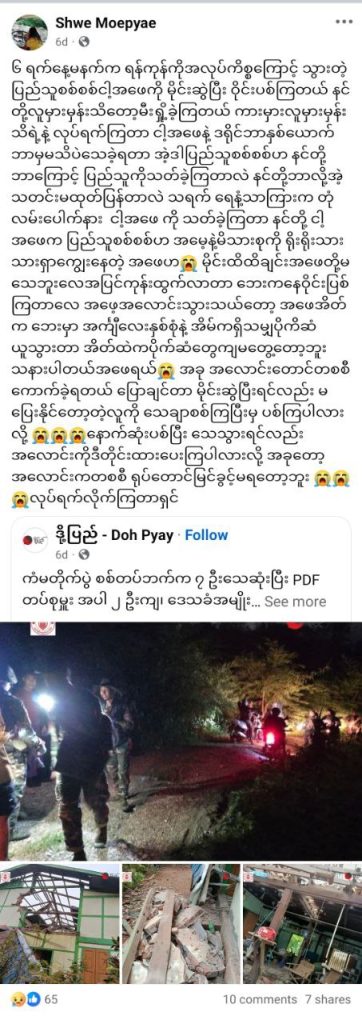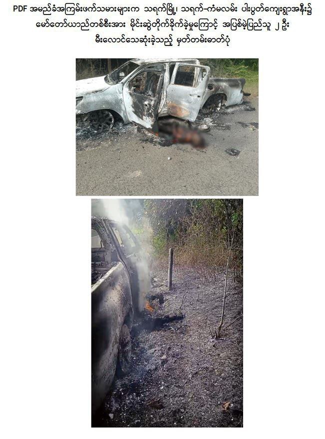 သရက်မြို့နယ်တစ်ဝိုက်တွင် သရက် PDF များသောင်းကျန်းနေပြီး ပြီးခဲ့သည့် နိုဝင်ဘာ ၆ ရက် နံနက် ၆ နာရီ ၃၀ မိနစ်အချိန်ကလည်း မကွေးတိုင်းဒေသကြီး၊ သရက်မြို့နယ်၊ ရွှေဘုံသာရပ်ကွက်နေ ဦးခင်မောင်မြင့်(၅၈)နှစ်သည် ရန်ကုန်တိုင်းဒေသကြီး၊ လှိုင်မြို့နေ ဦးကျော်လွင်(၄၅) နှစ်နှင့်အတူ ရွှေဘုံသာရပ်ကွက်မှ ရန်ကုန်မြို့သို့ သရက်-ကံမကားလမ်းအတိုင်း မော်တော်ယာဉ် တစ်စီးဖြင့် မောင်းနှင်ထွက်ခွာလာစဉ် ပါးပွတ်ကျေးရွာအနီးအရောက်၌ PDF များက မော်တော်ယာဉ်အား မိုင်းဆွဲတိုက်ခိုက်၍ သေနတ်ဖြင့် ဝိုင်းဝန်းပစ်ခတ်ပြီး မီးရှို့ဖျက်ဆီးခဲ့သဖြင့် ၎င်းတို့နှစ်ဦးတွင် မီးလောင်ဒဏ်ရာများ ရရှိကာ သေဆုံးသွားခဲ့ပြီး မော်တော်ယာဉ်မှာ မီးလောင်ပျက်စီး ဆုံးရှုံးခဲ့ကြောင်း သိရသည်။ အဆိုပါဖြစ်စဉ်အပေါ် NUG ၏ သရက်ခရိုင်စစ်ဌာန၊ သရက်ခရိုင်အမှတ် (၄) တပ်ရင်းက သရက်ခရိုင်၊ ကံမမြို့နယ်၊ ရေနံသာရဲစခန်းကို နိုဝင်ဘာ ၆ ရက်က ဒုတိယအကြိမ်သိမ်းပိုက်ရာတွင် စစ်တပ်လက်အောက်ခံ ၇ ဦးသေဆုံးသည်ဟု လိမ်လည်ထုတ်ပြန်ခဲ့သော်လည်း ဦးခင်မောင်မြင့်၏ သမီးဖြစ်သူ သုံးစွဲသော Shwe Moepyae အကောင့်က သရက် PDF တို့ လိမ်လည်ထုတ်ပြန်သောသတင်းဖော်ပြသည့် ဒို့ပြေ- Doh Pyay သတင်းဌာနတင်ဆက်သော သတင်းကို မျှဝေကာ သူမဖခင်မှာ သာမန်အရပ်သားဖြစ်ကြောင်း၊ မိုင်းဆွဲပြီး ကားမှောက်သွားချိန် အသက်မသေဘဲ ကားအောက်က ထွက်လာသည့် သူမဖခင်နှင့် မိတ်ဆွေကို သရက် PDF က ပစ်သတ်ပြီး ပါသမျှငွေအကုန်လုယက်ကာ ကားကိုမီးရှို့သွားသဖြင့် ရုပ်ပျက်ဆင်းပျက် အလောင်းပင်ရှုရက်စရာမရှိအောင် သေဆုံးသွားကြောင်း မျှဝေထားသည်။