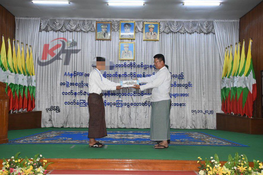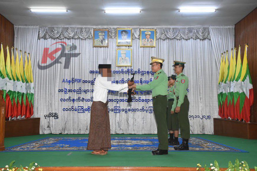 နိုင်ငံတော်အစိုးရသည် PDF အပါအဝင် အဖွဲ့အစည်းအမျိုးမျိုးအမည်ခံ၍ လက်နက်ကိုင်ဆန့်ကျင်လျက်ရှိသည့် အဖွဲ့အစည်းများအတွင်း ရောက်ရှိနေသူများအား ဥပဒေဘောင်အတွင်းသို့ ပြန်လည်ဝင်ရောက်ရန်ဖိတ်ခေါ်၍ ဥပဒေဘောင်အတွင်းသို့ ပြန်လည်ဝင်ရောက်လာကြသူများကိုလည်း လိုအပ်သည့်ကူညီပံ့ပိုးမှုများ ဆောင်ရွက်ပေးလျက်ရှိရာ နိုင်ငံတော်နှင့် တပ်မတော်၏ ငြိမ်းချမ်းရေးလုပ်ငန်းစဉ်များကို နားလည်သဘောပေါက်လာသည့် AA အဖွဲ့ဝင်အမျိုးသား ၉ ဦးနှင့် PDF အမည်ခံအဖွဲ့ဝင် အမျိုးသား ၆ ဦးတို့သည် လက်နက်၊ ခဲယမ်းများနှင့်အတူ ယမန်နေ့တွင် ဥပဒေဘောင်အတွင်းသို့ ဝင်ရောက်လာကြသည်။