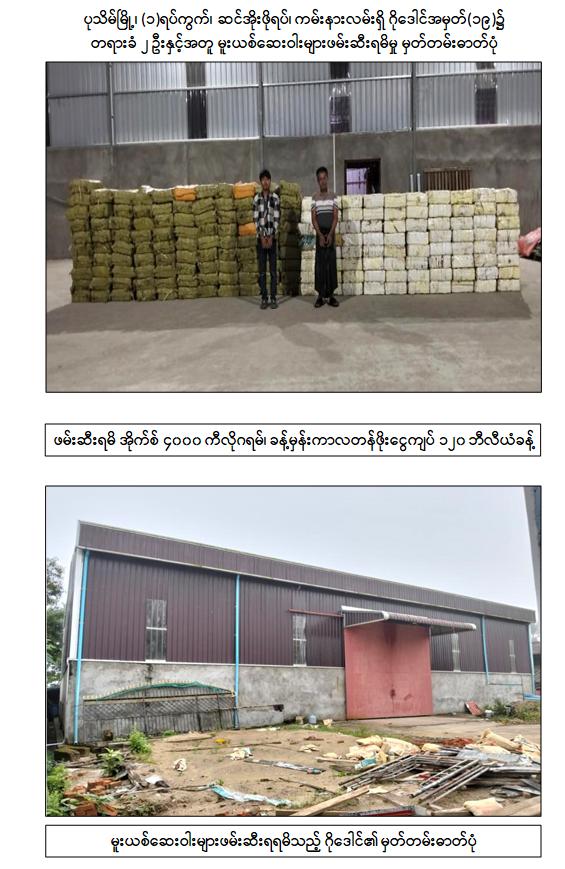 သို့ဖြစ်ပါ၍ ဖမ်းဆီးရမိတရားခံများအား ဥပဒေအရထိရောက်စွာအရေးယူနိုင်ရေး ဆက်လက် ဆောင်ရွက်သွားမည်ဖြစ်ကြောင်း၊ ဖမ်းဆီးရန်ကျန်တရားခံများနှင့်ဆက်စပ်တရားခံများအား ဖမ်းဆီး ဖော်ထုတ်နိုင်ရေးဆက်လက်ဆောင်ရွက်လျက်ရှိကြောင်းနှင့် မူးယစ်ဆေးဝါး သယ်ဆောင်သည့် သတင်း များရရှိပါက သက်ဆိုင်ရာသို့ လျှို့ဝှက်စွာသတင်းပေးတိုင်ကြားနိုင်ပါကြောင်း၊ သတင်းပေးသူနှင့် ပူးပေါင်းပါဝင်ဖမ်းဆီးပေးသူများအား ထိုက်တန်စွာလျှို့ဝှက်၍ ဆုငွေများချီးမြှင့် ပေးမည်ဖြစ်ကြောင်း အသိပေးသတင်းထုတ်ပြန်ထားသည်။