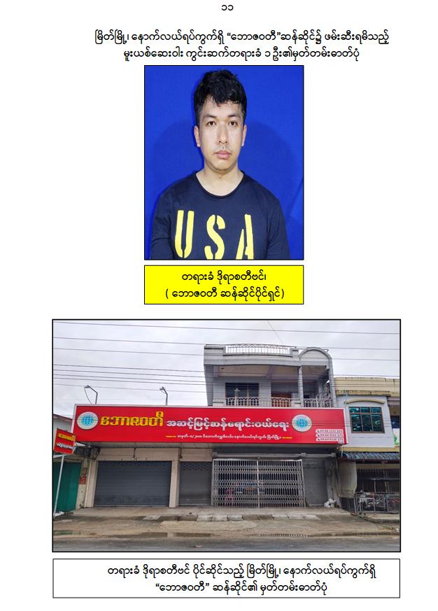 ဆက်လက်၍ နိုဝင်ဘာလ ၇ ရက် နေ့လည်ပိုင်းတွင် ဆိပ်ကြီးခနောင်တိုဆိပ်ကမ်း၌ လွန်းတင်ထားသော မူးယစ်ဆေးဝါးများ သယ်ဆောင်ရာတွင် အသုံးပြုသည့် “MV ရွှေဝတီ”ကုန်တင် သင်္ဘော ၁ စီးအား လည်းကောင်း၊ ညပိုင်းတွင် ရန်ကုန်အပြည်ပြည်ဆိုင်ရာလေဆိပ်၌ မူးယစ်ဆေးဝါးများ အားပုသိမ်မြို့မှ မလေးရှားနိုင်ငံသို့ ပို့ဆောင်ခိုင်းသူ “ဘောဇဝတီ” ဆန်လုပ်ငန်းနှင့် “ Utopia Future ” အိမ်ခြံမြေရောင်းဝယ်ရေးလုပ်ငန်းတို့အား ဟန်ပြလုပ်ကိုင်နေသော တရားခံ မောင်ငယ် အားလည်းကောင်း၊ နိုဝင်ဘာလ ၈ ရက်နေ့ ညနေပိုင်းတွင် ဧရာဝတီတိုင်းဒေသကြီး၊ ရွှေသောင်ယံမြို့၊ အမှတ်(၂)ရပ်ကွက်၊ အင်ကြင်းလမ်း၌ မူးယစ်ဆေးဝါးပို့ဆောင်ရာတွင်ပါဝင်ခဲ့သူ လှေလုပ်သား အောင်စိုးလင်း နှင့် အောင်ကိုလင်း တို့ ညီအစ်ကို ၂ ဦးအား လည်းကောင်း၊ နိုဝင်ဘာလ ၉ ရက်နေ့ ညနေပိုင်းတွင် မြိတ်မြို့၊ နောက်လယ်ရပ်ကွက်၊ ပိတောက်ရွှေဝါလမ်းရှိ “ဘောဇဝတီ”ဆန်ဆိုင်အနီးတွင် တရားခံ ထွန်းထွန်းလင်း အား လည်းကောင်း ထပ်မံဖမ်းဆီးရမိခဲ့သည်။