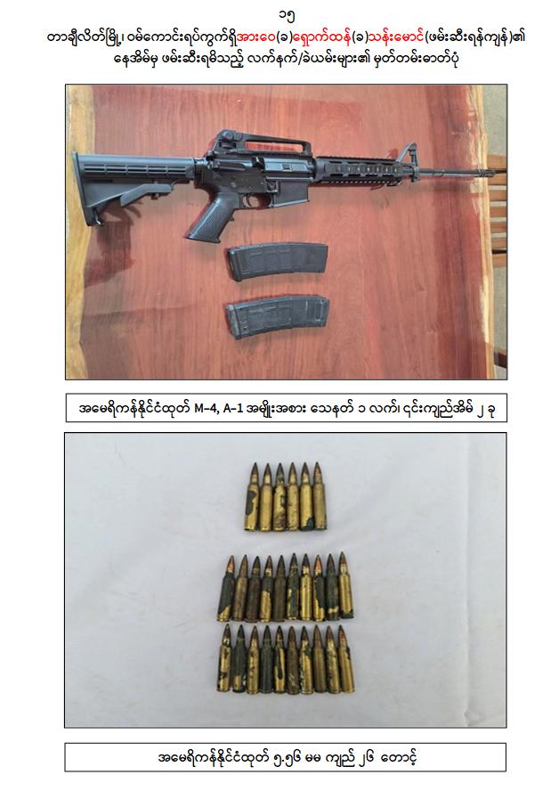 ဆက်လက်၍ လုံခြုံရေးတပ်ဖွဲ့ဝင်များ၏ သတင်းဖော်ထုတ်ချက်အရ နိုဝင်ဘာလ ၁၁ ရက်နေ့ နေ့လယ်ပိုင်းတွင် မူးယစ်ဆေးဝါးများပို့ဆောင်ရန် စေခိုင်းသူ ကွင်းဆက်တရားခံ အားဝေ(ခ)ရှောက်ထန် (ခ)သန်းမောင်(ဖမ်းဆီးရန်ကျန်)၏ အိမ်အမှတ်(၉/၄၇၀)၊ ရတနာလမ်းသွယ်(၈)၊ ဝမ်ကောင်းရပ်ကွက်၊ တာချီလိတ်မြို့နေအိမ်အား သွားရောက်ရှာဖွေရာ နေအိမ်အတွင်းမှ အမေရိကန်နိုင်ငံထုတ် M-4,A-1 သေနတ်(၁)လက်၊ ၎င်းကျည်အိမ် ၂ ခု၊ ၅.၅၆ ကျည် ၂၆ တောင့်၊ အီတလီနိုင်ငံထုတ် BERETTA အမျိုးအစား ပစ္စတို(၁)လက်၊ ၎င်းကျည်အိမ် ၁ ခု ၊ အမေရိကန်နိုင်ငံထုတ် SIG SAUER အမျိုးအစား ပစ္စတို(၁)လက်၊ ၎င်းကျည်အိမ် ၂ ခု တို့အားလည်းကောင်း၊ နိုဝင်ဘာလ ၁၆ ရက်တွင် ကျောင်းကုန်း မြို့နယ်၊ (၁)ရပ်ကွက်၊ ဌာနလမ်း၌ တရားခံ ဒိုရာမော့စ် နှင့် ပုသိမ်မြို့၊ (၃)ရပ်ကွက်၊ မြကျွန်းသာအိမ်ရာရှိ ရွှေမင်းသမီးဟိုတယ်၌ တရားခံ ပီတာဖိုး တို့ ၂ ဦးအား ထပ်မံဖမ်းဆီးရမိခဲ့သဖြင့် ဖြစ်စဉ်တွင် တရားခံ ကျား ၂၄ ဦး၊ M-4,A-1 သေနတ်(၁)လက်၊ ပစ္စတို(၂)လက်၊ ကုန်တင်သင်္ဘော ၂ စီးတို့အား ဖမ်းဆီးရမိ ခဲ့ကြောင်း သိရှိရသည်။