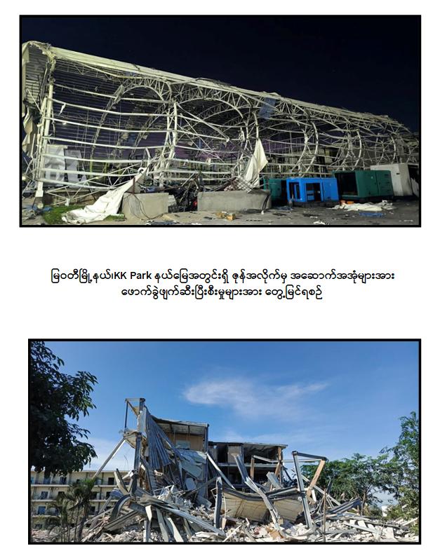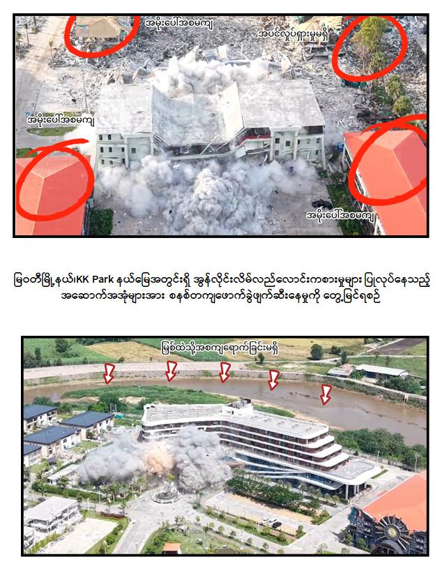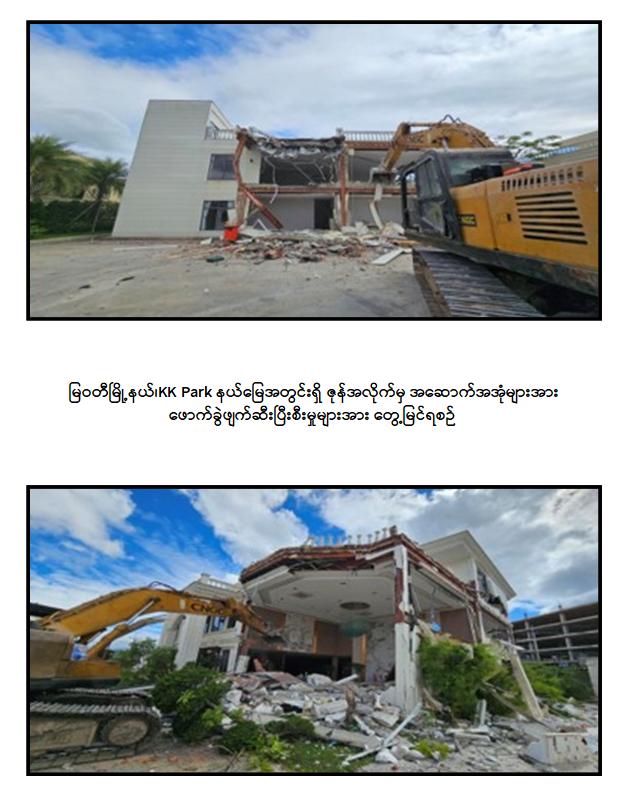 အွန်လိုင်းလောင်းကစားနှင့် လိမ်လည်မှုများ ဆောင်ရွက်နေသည့် KK Park နယ်မြေအား ထပ်မံအခြေမချနိုင်ရန်အတွက် အဆောက်အအုံများကို ၁၀၀ ရာခိုင်နှုန်း ဖျက်ဆီးနိုင်အောင် စက်ယန္တရားများအပြင် အဆင့်မြင့် ဖောက်ခွဲမှုများဖြင့်ပါ ဆောင်ရွက်ခဲ့ကြောင်းလည်း သတင်းထုတ်ပြန်ရေးအဖွဲ့ခေါင်းဆောင် ဗိုလ်ချုပ်ဇော်မင်းထွန်းက ပြောကြားသည်။