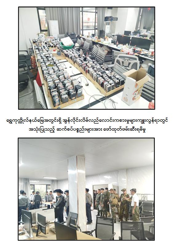 “နိုဝင်ဘာလ ၁၈ ရက်နေ့မနက်မှာပဲ မြဝတီမြို့ရဲ့ မြောက်ဘက်မှာရှိတဲ့ ရွှေကုက္ကိုလ်နယ်မြေကို ဌာနဆိုင်ရာအဖွဲ့ အစည်းတွေနဲ့ လုံခြုံရေးပူးပေါင်းတပ်ဖွဲ့ဝင်များက ဝင်ရောက်ရှင်းလင်းခဲ့ပါတယ်။ ပထမဦးစွာ အဲဒီထဲမှာရှိနေတဲ့ ခွင့်ပြုချက်မရရှိဘဲ ဆောက်လုပ်ထားတဲ့ အဆောက်အအုံ ၃ လုံးကို အရင်ဝင်ရောက်ရှင်းလင်းခဲ့ပါတယ်။ အဲဒီထဲကနေ စိစစ်ဆဲ နိုင်ငံခြားသား ၃၄၆ ဦး ဖမ်းမိခဲ့ပါတယ်။ Online လောင်းကစားမှုမှာ အသုံးပြုနေတဲ့ ဖုန်းအလုံးရေ တစ်သောင်းနီးပါးလောက် ဖမ်းဆီးရမိခဲ့ပြီး ဆက်စပ်ပစ္စည်းတွေလည်း ဖမ်းဆီးရမိခဲ့ပါတယ်။ တစ်ဖက်နိုင်ငံကို ထွက်ပြေးမယ့်သူတွေကိုလည်း ကျွန်တော်တို့ ပိတ်ဆို့ ဖမ်းဆီးလျက်ရှိပါတယ်။ ဒီနယ်မြေမှာ Online လောင်းကစားမှုလုပ်ဆောင်နေတဲ့ နယ်မြေ ၃ ခုရှိပါတယ်။ အဲဒါတွေကတော့ နံပါတ်တစ်ကတော့ KK Park နယ်မြေ၊ နံပါတ်နှစ်ကတော့ ရွှေကုက္ကိုလ်နယ်မြေနဲ့ နံပါတ်သုံးကတော့ ကျောက်ခတ်နယ်မြေဖြစ်ပါတယ်။ KK Park နယ်မြေကတော့ အားလုံးသိတဲ့အတိုင်းပဲ မြဝတီမြို့ရဲ့ တောင်ဘက်မှာရှိတယ်။ ရွှေကုက္ကိုလ် နယ်မြေကတော့ မြဝတီမြို့ရဲ့ မြောက်ဘက်မှာရှိတယ်။ ကျောက်ခတ်ဒေသကတော့ တောင်ဘက်အစွန်ဆုံးပေါ့။ KK Park ရဲ့တောင်ဘက်မှာရှိတဲ့ နယ်မြေတွေဖြစ်ပါတယ်။ ဒီနေရာတွေမှာ ဘယ်သူတွေပါဝင်ပတ်သက်နေတယ်ဆိုတဲ့ဟာကလည်း ကျွန်တော် ယခင်တုန်းက အတိအလင်း ပြောကြားခဲ့ပြီးဖြစ်ပါတယ်။ KK Park နယ်မြေနဲ့ ပတ်သက်ပြီး ကျွန်တော် အားလုံးကို ရှင်းလင်းပြောပြတဲ့နေရာမှာ အထောက်အထားတွေနဲ့ ဘယ်သူတွေနဲ့ ဘယ်အချိန်တုန်းက စာချုပ်ချုပ်ခဲ့တယ်၊ KNU အဖွဲ့ထဲက သူတွေနဲ့ စာချုပ်ဘယ်လိုချုပ်ခဲ့တယ်၊ ဘယ်လိုမျိုးဆောင်ရွက်ခဲ့တယ်၊ ဘယ်သူတွေပါဝင်ပတ်သက်ခဲ့တယ်ဆိုတာ ကျွန်တော် ရှင်းလင်းပြောကြားပြီးဖြစ်ပါတယ်။ KK Park နယ်မြမှာ အဓိကကတော့ မုလအိအလင်းကုမ္ပဏီ၊ Tran-Asia International Holding Group (Thailand)ကုမ္ပဏီတွေ ပါဝင်ပတ်သက်တာဖြစ်ပါတယ်။ ရွှေကုက္ကိုလ်နယ်မြေမှာကတော့ Myanmar Yatai International Holding Group ကုမ္ပဏီ ပါဝင်ပတ်သက်တာဖြစ်ပါတယ်။ ကျောက်ခတ်နယ်မြေမှာကတော့ Chongkhaed Garden Resort ကုမ္ပဏီက ပါဝင်ပတ်သက်တာဖြစ်ပါတယ်။ အဲဒီနယ်မြေမှာ ရောက်ရှိပြီး Online လောင်းကစားမှုတွေ၊ Online လိမ်လည်မှုတွေ လုပ်ဆောင်နေတယ်ဆိုတဲ့ နိုင်ငံခြားသားတွေ ဘယ်လိုမျိုးရောက်ရှိလာသလဲဆိုတဲ့ဟာကို ကျွန်တော်တို့ရှင်းပြပြီး ဖြစ်ပါတယ်။ အဲဒီကိုရောက်ရှိလာတဲ့ Online လိမ်လည်တဲ့ နိုင်ငံခြားသားတွေဟာ ၉၉ ဒသမ ၅ ရာခိုင်နှုန်းလောက်က တစ်ဖက်နိုင်ငံကနေတစ်ဆင့် မြန်မာနိုင်ငံထဲကို ကူးပြောင်းရောက်ရှိလာတာဖြစ်ပါတယ်။ အဲဒီနယ်မြေမှာ ၂၀၂၁ ခုနှစ်နောက်ပိုင်းမှာ တိုက်ပွဲတွေဖြစ်ပွားခဲ့ပြီးတော့ မြဝတီမြို့နဲ့ အလှမ်းကွာဝေးတဲ့ ခုနကနယ်မြေတွေမှာ တိုင်းရင်းသားလက်နက်ကိုင် EAOs, KNU, KNLA အဖွဲ့၊ ပြီးရင် NCA စာချုပ