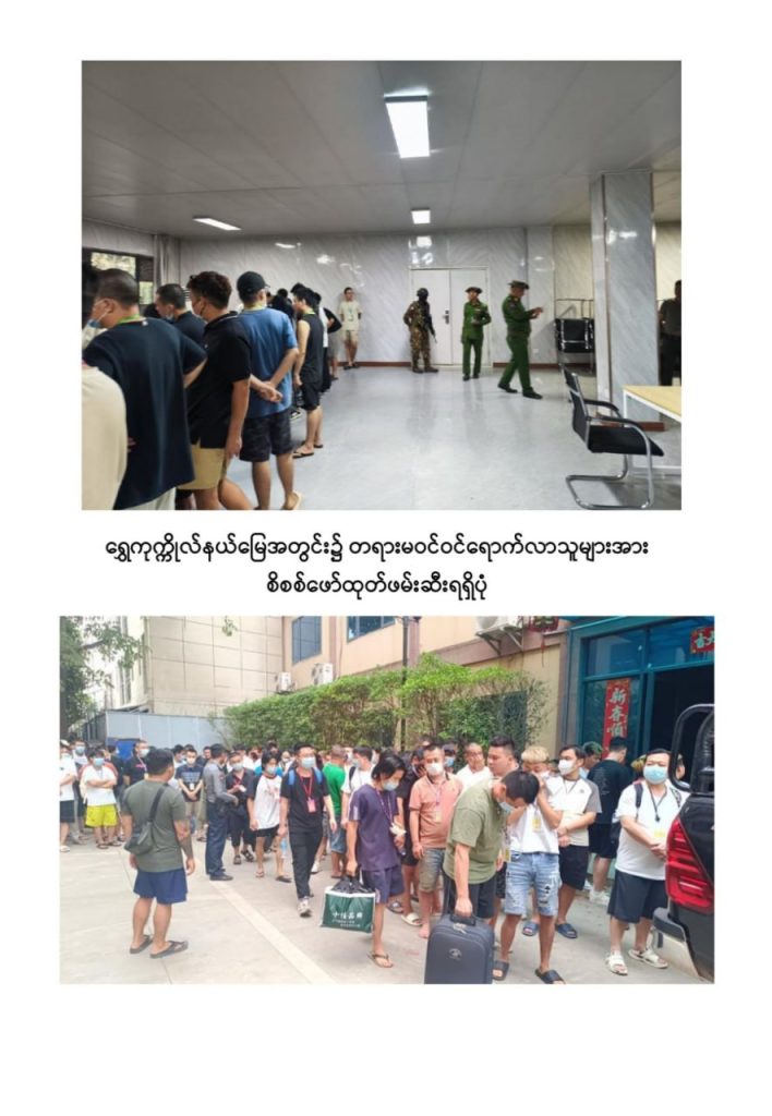အလားတူ ရွှေကုက္ကိုလ်နယ်မြေအတွင်း၌လည်း ရှင်းလင်းဖော်ထုတ်မှုများကို ယမန်နေ့မှစ၍ စတင်ဆောင်ရွက်လျက်ရှိပြီး တရားမဝင်နေထိုင်သူ ၃၄၆ ဦး ဖမ်းမိခဲ့သလို ယနေ့ဒုတိယနေ့အဖြစ်ရှင်းလင်းမှုများ ဆက်လက်ဆောင်ရွက်ခဲ့ရာ ညနေ ၆ နာရီအထိ ခွင့်ပြုချက်မရှိဘဲ ဆောက်လုပ်ထားသည့် အဆောက်အဦ ၁၃ လုံးအတွင်းမှ မြန်မာနိုင်ငံအတွင်းသို့ တရားမဝင် ဝင်ရောက်နေထိုင်လျက်ရှိသည့် တရုတ်နိုင်ငံသား ၁၈၄ ဦး၊ မလေးရှားနိုင်ငံသား ၃ ဦး၊ ဖိလစ်ပိုင်နိုင်ငံသား ၁၄ ဦး၊ နီပေါနိုင်ငံသား ၂ ဦး၊ ထိုင်းနိုင်ငံသား ၆ ဦး၊ ဗီယက်နမ်နိုင်ငံသား ၇ ဦး၊ နိုင်ဂျီးရီးယားနိုင်ငံသား ၁ ဦး၊ အင်ဒိုနီးရှားနိုင်ငံသား ၄၈ ဦး၊ စုစုပေါင်း ၂၆၅ ဦးနှင့် Online လိမ်လည်လောင်းကစားမှုများကျူးလွန်ရာတွင် အသုံးပြုသည့် ကွန်ပျူတာ ၂၃၃၉ လုံး၊ မိုဘိုင်းဖုန်း ၂၉၅၀ လုံး နှင့် လုပ်ငန်းသုံးပစ္စည်းအများအပြားကို စိစစ်တွေ့ရှိဖမ်းဆီးရမိခဲ့သည်။ သို့ဖြစ်၍ ရွှေကုက္ကိုလ်နယ်မြေအတွင်း စုစုပေါင်း ဖော်ထုတ်ရှင်းလင်းမှုများအရ မြန်မာနိုင်ငံအတွင်းသို့ တရားမဝင် ဝင်ရောက်နေထိုင်လျက်ရှိသည့် စိစစ်ဆဲနိုင်ငံခြားသား ၆၁၁ ဦးနှင့် Online လိမ်လည်လောင်းကစားမှုများ ကျူးလွန်ရာတွင် အသုံးပြုသည့် ကွန်ပျူတာ ၂၆၅၃ လုံး၊ မိုဘိုင်းဖုန်း ၁၉၆၅၀ လုံးနှင့် လုပ်ငန်းသုံးပစ္စည်းအများအပြားကို စိစစ်တွေ့ရှိဖမ်းဆီးရရှိခဲ့ပြီး ဖော်ထုတ်ရှင်းလင်းခြင်းများ ကို ဆောင်ရွက်လျက်ရှိကြောင်း သိရှိရသည်။