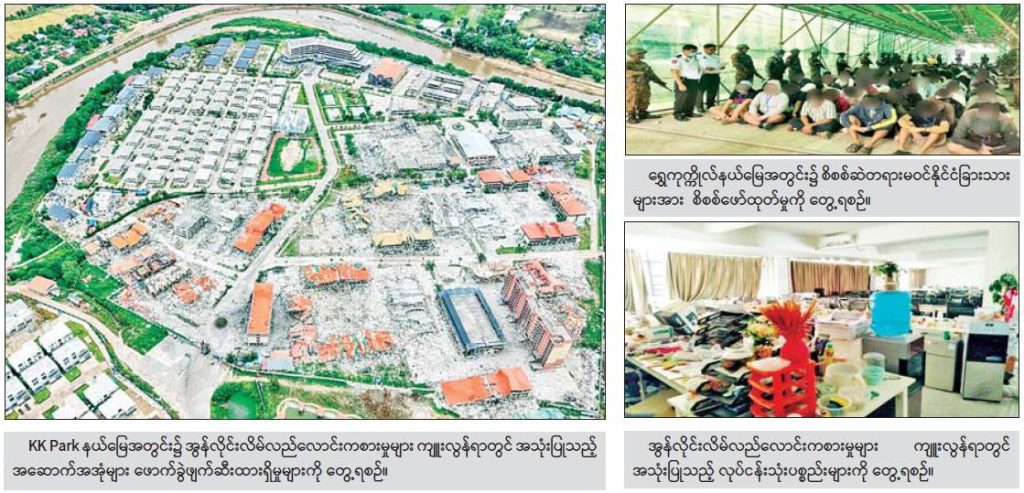 မြန်မာနိုင်ငံအစိုးရအနေဖြင့် နိုင်ငံတကာနှင့် တစ်ကမ္ဘာလုံးကိုအန္တရာယ်ပေးနေသည့် online လိမ်လည်မှုများ၊ online လောင်းကစားမှုများ တိုက်ဖျက်ရေးလုပ်ငန်းစဉ်များကို အမျိုးသားရေးတာဝန်တစ်ရပ်အနေဖြင့် အလေးထား တိုက်ဖျက်ဆောင်ရွက်လျက်ရှိရာ မြဝတီဒေသအတွင်း ကျားဖြန့်ဂိုဏ်းများလည်ပတ်ရာ KK Park ရှိ ကျားဖြန့်အဆောက်အအုံများဖြိုဖျက်မှု ၄၆၃ လုံးသာ ကျန်ရှိတော့သလို ရွှေကုက္ကိုလ်နယ်မြေမှလည်း ဖမ်းဆီးထိန်းသိမ်းထားသူ ၁၀၁၆ ဦး ဖြစ်လာခဲ့သည်ဟု သိရသည်။