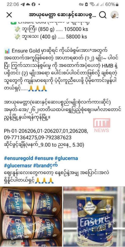ယနေ့ နေ့လယ်ပိုင်းတွင် ဖြစ်ပွားခဲ့သည့် လူကြီးများအဓိကသောက်သုံးသည့် Ensure ကို အွန်လိုင်းမှတစ်ဆင့် လိမ်လည်ရောင်းချသူများ၏ ဆိုင်အမည်မှာ အာယုမေတ္တာ (ဆေးနှင့်ဆေးပစ္စည်းမျိုးစုံလက်ကားဆိုင်) ဟုလည်း သိရပြီး ဆိုင်အမှတ်ကိုလည်း အမှတ်- အေ/၂၆၂၊ တတိယအထပ်၊ ရွှေပြည့်စုံဈေး၊ မင်္ဂလာတောင်ညွှန်မြို့နယ်၊ ရန်ကုန်မြို့ဆိုသည့် ဆိုင်လိပ်စာပေးကာ လိမ်လည်နေခြင်းဖြစ်သည်ဟု သိရသည်။