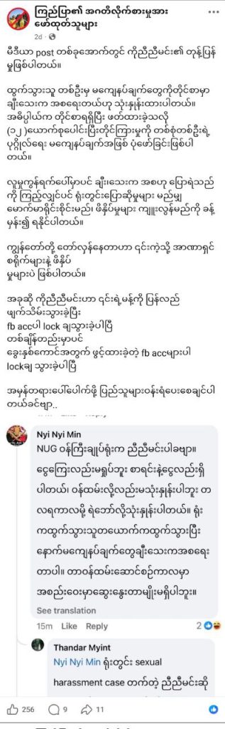 ပုံစာ။ NUG အမြဲတမ်းအတွင်းဝန် ကြည်ပြာနှင့် လင်ဖြစ်သူ ညီညီမင်းအကြောင်း တိုင်စာ၊ ပို့စ် အချို့။
