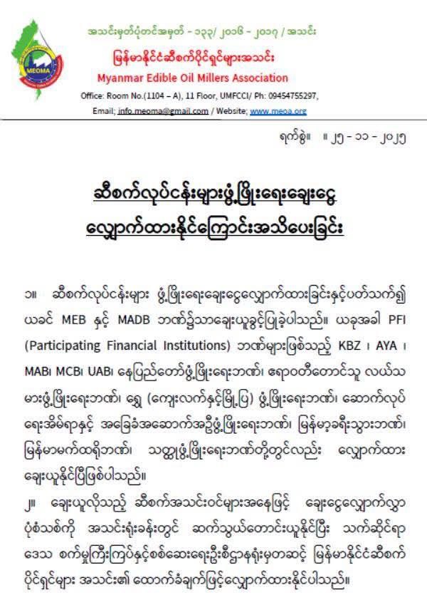 ဆီစက်လုပ်ငန်းများဖွံ့ဖြိုးရေးချေးငွေအား မြန်မာ့စီးပွားရေးဘဏ် (MEB) နှင့် မြန်မာ့လယ်ယာဖွံ့ဖြိုးရေးဘဏ် (MADB) တို့အပြင် အခြားဘဏ် ၁၂ ခုတွင်လည်း ချေးငွေများ လျှောက်ထားနိုင်ပြီဖြစ်ကြောင်း မြန်မာနိုင်ငံဆီစက်ပိုင်ရှင်များအသင်းမှ ယနေ့တွင် အသိပေးထုတ်ပြန်ထားသည်။