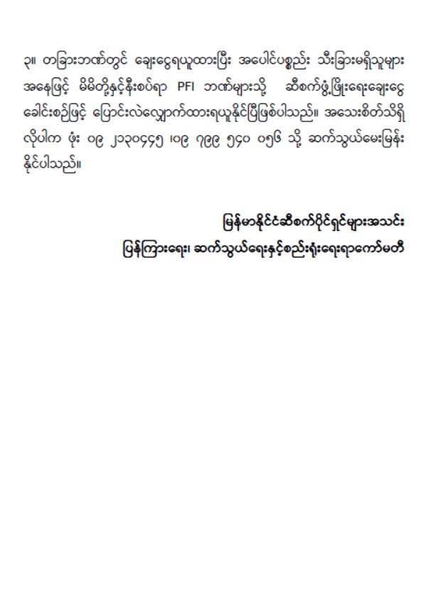 တခြားဘဏ်တွင် ချေးငွေရယူထားပြီး အပေါင်ပစ္စည်း သီးခြားမရှိသူများအနေဖြင့် မိမိတို့နှင့်နီးစပ်ရာ PFI ဘဏ်များသို့ ဆီစက်ဖွံ့ဖြိုးရေးချေးငွေ ခေါင်းစဉ်ဖြင့် ပြောင်းလဲလျှောက်ထားရယူနိုင်ပြီဖြစ်ကြောင်းနှင့် အသေးစိတ်သိရှိလိုပါက ဖုန်းနံပါတ် ၀၉-၂၁၃၀၄၄၅ ၊ ၀၉-၇၉၉ ၅၄၀၀၅၆ သို့ ဆက်သွယ်မေးမြန်းနိုင်ကြောင်း အသိပေးထားသည်။