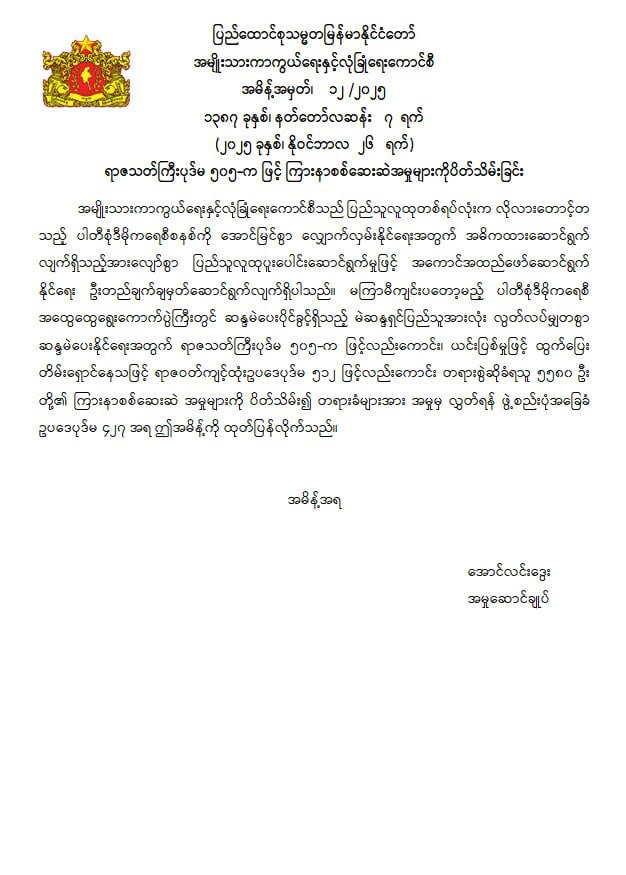 ထို့အပြင် အမျိုးသားကာကွယ်ရေးနှင့်လုံခြုံရေးကောင်စီ အမိန့်အမှတ် (၁၂ /၂ဝ၂၅) ဖြင့် မကြာမီကျင်းပတော့မည့် ပါတီစုံဒီမိုကရေစီ အထွေထွေရွေးကောက်ပွဲကြီးတွင် ဆန္ဒမဲပေးပိုင်ခွင့်ရှိသည့် မဲဆန္ဒရှင်ပြည်သူအားလုံး လွတ်လပ်မျှတစွာ ဆန္ဒမဲပေးနိုင်ရေးအတွက် ရာဇသတ်ကြီးပုဒ်မ ၅၀၅-က ဖြင့်လည်းကောင်း၊ ယင်းပြစ်မှုဖြင့် ထွက်ပြေး တိမ်းရှောင်နေသဖြင့် ရာဇဝတ်ကျင့်ထုံးဥပဒေပုဒ်မ ၅၁၂ ဖြင့်လည်းကောင်း တရားစွဲဆိုခံရသူ ၅,၅၈၀ ဦး တို့၏ ကြားနာစစ်ဆေးဆဲ အမှုများကို ပိတ်သိမ်း၍ တရားခံများအား အမှုမှလွှတ်ရန် ဖွဲ့စည်းပုံအခြေခံ ဥပဒေပုဒ်မ ၄၂၇ အရ အမိန့် ထုတ်ပြန်လိုက်သည်ဟု သိရသည်။