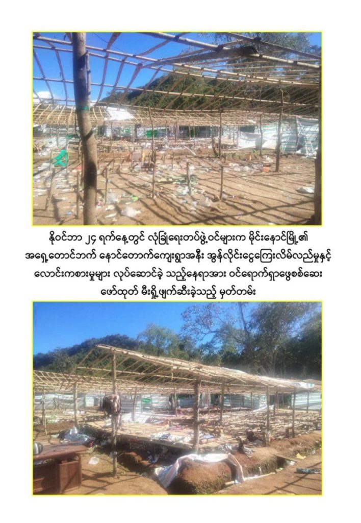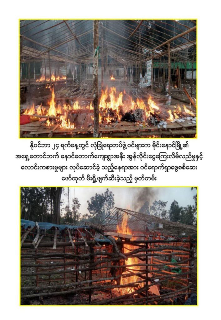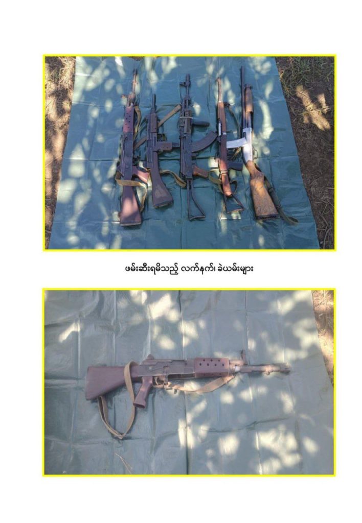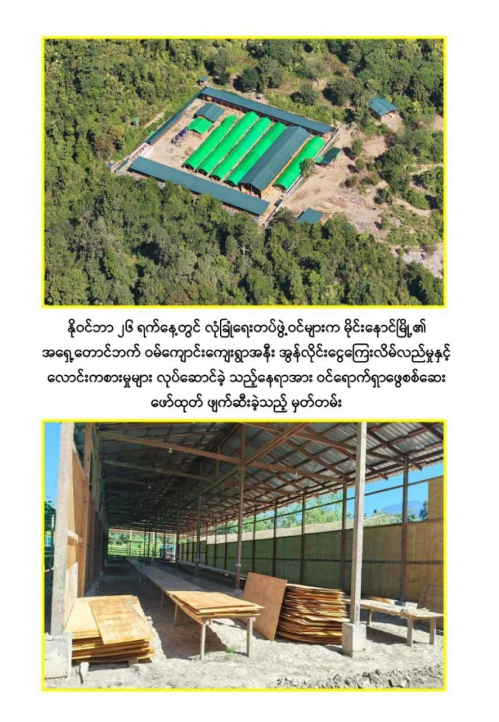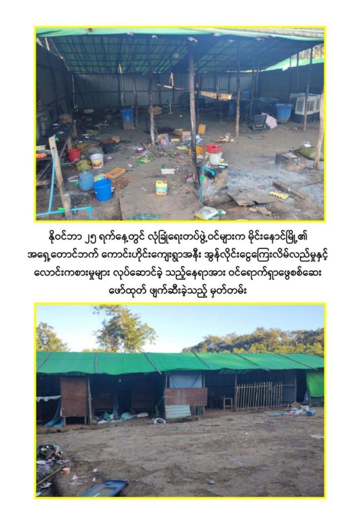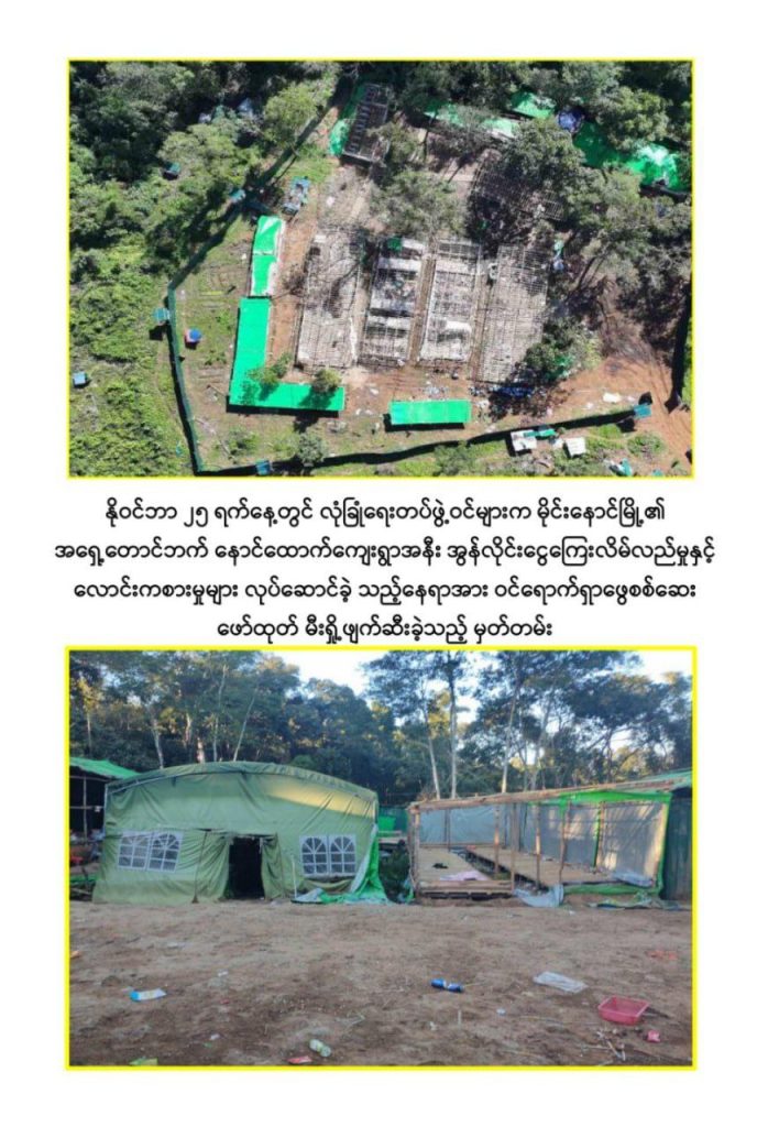 ဆက်လက်၍ လုံခြုံရေးတပ်ဖွဲ့ဝင်များသည် နယ်မြေလုံခြုံရေးလုပ်ငန်းများဆောင်ရွက်ခဲ့ရာ နိုဝင်ဘာ ၂၆ ရက်တွင် မိုင်းနောင်မြို့၏ အရှေ့တောင်ဘက် ဝမ်ကျောင်းကျေးရွာအနီး၌ အွန်လိုင်းလိမ်လည်မှုနှင့် လောင်းကစားလုပ်ငန်းဆောင်ရွက်ရန် ဆောက်လုပ်လျက်ရှိသည့် အလျားပေ ၁၅၀၊ အနံ ၁၅ ပေ၊ အမြင့် ၁၅ ပေရှိ သွပ်မိုးတဲ (လူမနေ) တစ်လုံး၊ အလျားပေ ၁၂၀၊ အနံပေ ၃၀၊ အမြင့် ၁၅ ပေရှိ သွပ်မိုးအလုပ်ရုံ တစ်လုံး၊ အလျား ပေ ၁၅၀၊ အနံ ခြောက်ပေ၊ အမြင့်ရှစ်ပေရှိ သွပ်မိုးအထပ်သားကာ တစ်လုံး၊ အလျား ၁၅ ပေ၊ အနံ ခြောက်ပေ၊ အမြင့် ရှစ်ပေရှိ သွပ်မိုးအထပ်သားကာ တစ်လုံး၊ အလျား ပေ ၁၅၀၊ အနံ ၁၅ ပေ၊ အမြင့် ၁၅ ပေရှိ သွပ်မိုးတဲ(လူမနေ) တစ်လုံး၊ အလျားပေ ၈၀၊ အနံ ၁၅ ပေ၊ အမြင့် ၁၅ ပေရှိ အမိုးအကာမရှိတဲ တစ်လုံး၊ အလျားပေ ၁၀၀၊ အနံ ၂၅ ပေ၊ အမြင့် ၁၅ ပေရှိ သွပ်မိုး အထပ်သားကာတဲ တစ်လုံး၊ အလျားပေ ၁၀၀၊ အနံ ၂၅ ပေ၊ အမြင့် ၁၅ ပေရှိ အမိုးအကာမရှိ ပြိုကျတဲ တစ်လုံး၊ အလျားပေ ၁၀၀၊ အနံ ၂၅ ပေ၊ အမြင့် ၁၅ ပေရှိ မိုးကာမိုးတဲ တစ်လုံး၊ အလျား ပေ ၁၀၀၊ အနံ ၂၅ ပေ၊ အမြင့် ၁၅ ပေရှိ မိုးကာမိုးပြိုကျတဲ တစ်လုံး၊ အလျားပေ ၂၀၊ အနံပေ ၁၂၀၊ အမြင့် ၁၅ ပေရှိ မိုးကာမိုးအထပ် သားဂိုဒေါင်တစ်လုံး၊ အလျားပေ ၂၀ ပတ်လည်သွပ်မိုးအထပ်သားကာ လူနေအိမ်တစ်လုံး၊ အလျား ပေ ၁၅၀၊ အနံ ၁၅ ပေ၊ အမြင့် ၁၅ ပေရှိ အမိုးမရှိတဲ နှစ်လုံး၊ ဂါလန် ၈၀၀ ဆံ့ တိုင်ကီအပြာ လေးလုံးတို့ကိုလည်းကောင်း၊ မိုင်းနောင်မြို့၏ အရှေ့တောင်ဘက် နောင်တောက်ကျေးရွာ၏ တောင်ဘက်နေရာတစ်ဝိုက်အား ထပ်မံ၍ရှင်းလင်းရာ အွန်လိုင်းလိမ်လည် လောင်းကစားမှုများလုပ်ကိုင်နေသူများဖြစ်သည့် တရုတ်နိုင်ငံသား ၂၆ ဦးနှင့် မြန်မာနိုင်ငံသား ရှစ်ဦးတို့ကိုလည်းကောင်း ဖမ်းဆီးရမိခဲ့ပြီး ၎င်းတို့၏ ဖော်ထုတ်ချက်များအရ အဆိုပါကျေးရွာအနီး၌ သိုဝှက်သိမ်းဆည်းထားသည့် MA-1 သေနတ် တစ်လက်၊ MA-13 သေနတ် တစ်လက်၊ AK – 12 သေနတ် တစ်လက်၊ ကာဘိုင် သေနတ် တစ်လက်၊ WINCHESTER 12 V သေနတ် တစ်လက်၊ ၉ မမကျည် ၁၀ တောင့်၊ 12 V ကျည် နှစ်တောင့်၊ ၉ မမကျည်အိမ် တစ်ခု၊ AK ကျည်အိမ် တစ်ခုနှင့် ကာဘိုင် ကျည်အိမ် တစ်ခုတို့ကို သိမ်းဆည်း ရမိခဲ့ကြောင်း သိရသည်။