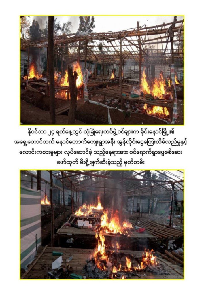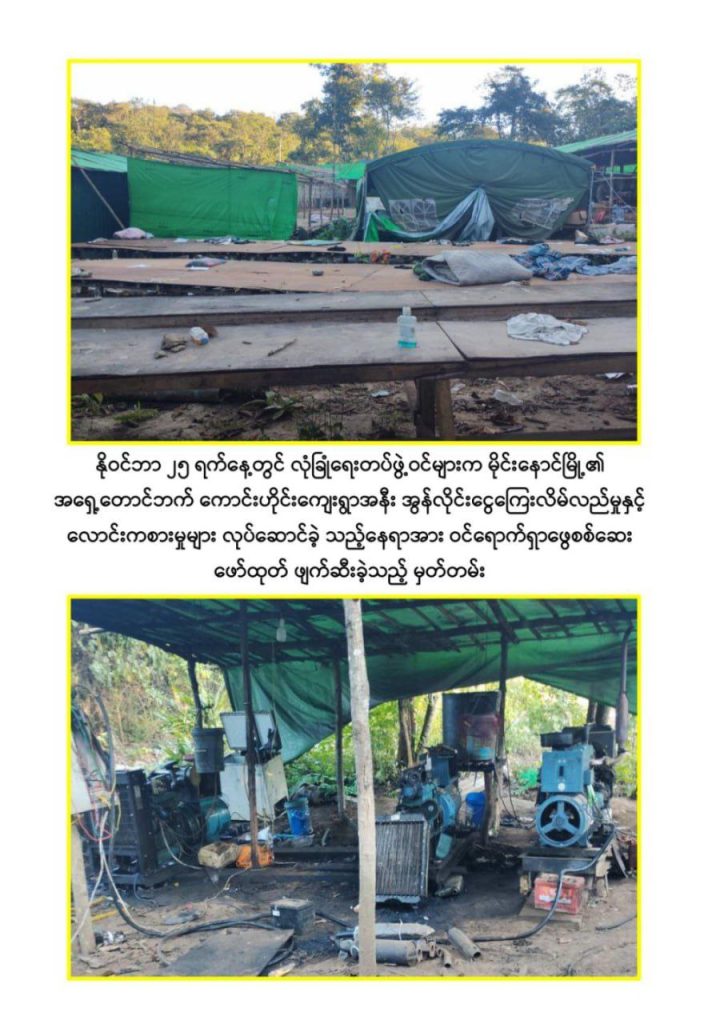 ဆက်လက်၍ လုံခြုံရေးတပ်ဖွဲ့ဝင်များသည် နယ်မြေလုံခြုံရေးလုပ်ငန်းများ ဆက်လက်ဆောင်ရွက်စဉ် နိုဝင်ဘာ ၂၅ ရက်တွင် မိုင်းနောင်မြို့၏ အရှေ့တောင်ဘက် ကောင်းဟိုင်းကျေးရွာအနီး၌ အွန်လိုင်းလိမ်လည်လောင်းကစားမှုများ လုပ်ကိုင်ဆောင်ရွက်ခဲ့သည့် ယာယီအဆောက်အအုံများနှင့် လုပ်ငန်းသုံးဆက်စပ်ပစ္စည်းများဖြစ်သော အလျားပေ ၇၀၊ အနံပေ ၃၀ ရှိ ယာယီလူနေမိုးကာတဲ သုံးလုံး၊ အလျားပေ ၄၀၊ အနံ ပေ ၄၀ ရှိ ယာယီလူနေမိုးကာတဲ နှစ်လုံး၊ အလျား ၂၅ ပေ၊ အနံ ၁၅ ပေရှိ ယာယီလူနေမိုးကာတဲ တစ်လုံး၊ အလျားပေ ၂၀၊ အနံ ၁၅ ပေရှိ ယာယီလူနေမိုးကာတဲ ၂၈ လုံး၊ မီးစက်သုံးလုံး၊ ရေခဲသေတ္တာ အသေးတစ်လုံး၊ FREEZER တစ်လုံး၊ AIR COOLER ငါးလုံးနှင့် လန်ခရူဇာမော်တော်ယာဉ် တစ်စီးတို့ကို ထပ်မံတွေ့ရှိသိမ်းဆည်း ရမိခဲ့ကြောင်းသိရသည်။