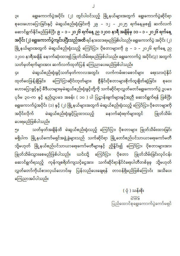 ရွေးကောက်ပွဲအပိုင်း (၂) တွင် ပါဝင်သည့် မြို့နယ်များအတွက် ရွေးကောက်ပွဲဆိုင်ရာ စုဝေးဟောပြောခြင်းနှင့် မဲဆွယ်စည်းရုံးခြင်းကို (၂၉ -၁၂-၂၀၂၅) ရက်နေ့မှစ၍ ဆက်လက် ဆောင်ရွက်နိုင်မည်ဖြစ်ပြီး (၉-၁-၂၀၂၆) ရက်နေ့ ည ၁၂ နာရီ အချိန်မှ (၁၁-၁- ၂ဝ၂၆) ရက်နေ့ အပိုင်း (၂) ရွေးကောက်ပွဲ ကျင်းပပြီးသည်အထိ ရပ်နားထားရမည်ဖြစ်သည်။ ရွေးကောက်ပွဲ အပိုင်း (၂) မြို့နယ်များအတွက် မဲဆွယ်စည်းရုံးသည့် ကြော်ငြာ၊ ပိုစတာများကို (၉-၁-၂၀၂၆) ရက်နေ့ ည ၁၂ နာရီအချိန် နောက်ဆုံးထား၍ ဖြုတ်သိမ်းရမည်ဖြစ်ပါသည်။