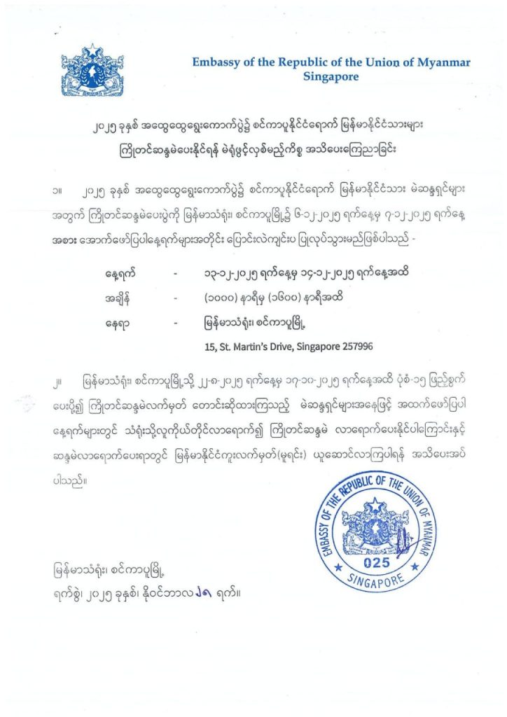 စင်ကာပူနိုင်ငံဆိုင်ရာ မြန်မာသံရုံးတွင် ကြိုတင်မဲပေးရာတွင် ပုံစာ ၁၅ ဖြည့်စွက်၍ ကြိုတင်ဆန္ဒမဲလက်မှတ်တောင်းဆိုထားသည့် မဲဆန္ဒရှင်များအနေဖြင့် ဆန္ဒမဲလာရောက်ပေးရာတွင် မြန်မာနိုင်ငံကူးလက်မှတ်(မူရင်း) ယူဆောင်လာရန်လည်း ကြေညာထားသည်။