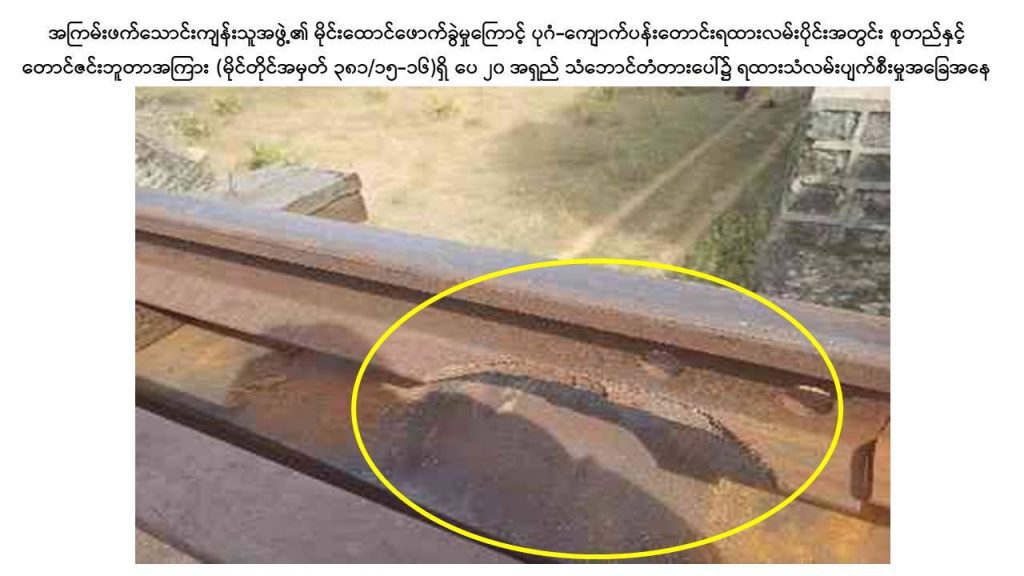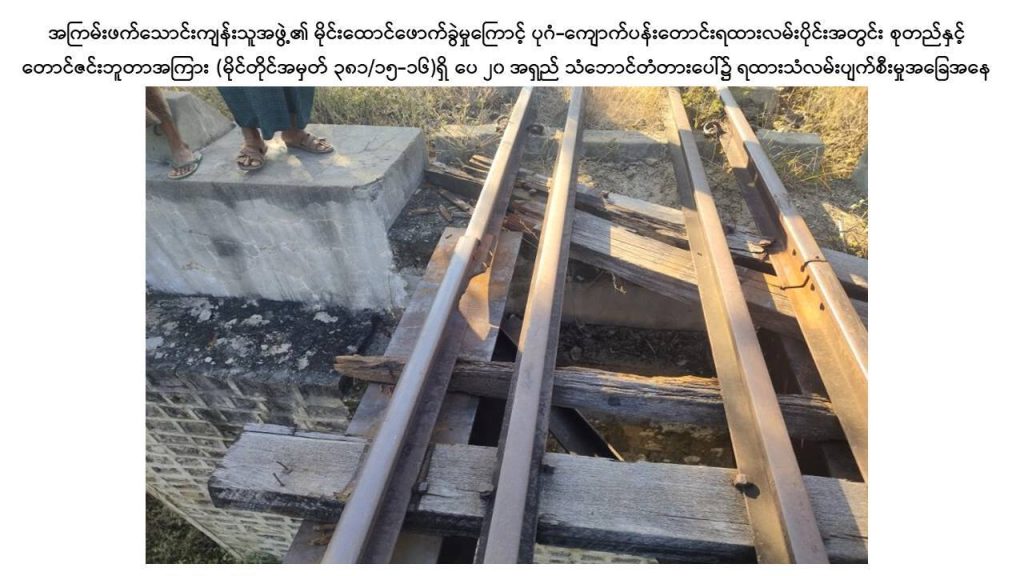အကြမ်းဖက်သောင်းကျန်းသူအဖွဲ့များအနေဖြင့် ၂၀၂၁ ခုနှစ်၊ ဖေဖော်ဝါရီလမှစ၍ ယခု အချိန်အထိ မြန်မာ့မီးရထားလမ်းကွန်ရက်တစ်ခုလုံးတွင် ရထားလမ်းနှင့် ရထားဘူတာ နယ်မြေ အတွင်း မိုင်းထောင်ဖောက်ခွဲဖျက်ဆီးခြင်း(၈၃)ကြိမ်၊ ရထားတံတား/သံလမ်းများအား မိုင်းထောင် ဖောက်ခွဲ ဖျက်ဆီးခြင်း(၁၇၉)ကြိမ်၊ ဘူတာအဆောက်အဦနှင့် ဝန်ထမ်းနေအိမ်များအား မီးရှို့ ဖျက်ဆီးခြင်း(၁၆)ကြိမ် ကျူးလွန်ခဲ့ကြပြီး နိုင်ငံတော်ပိုင်ရထားစက်ခေါင်းနှင့် တွဲများ၊ ရထားလမ်း နှင့် တံတားများ၊ ခရီးသည်များနှင့် ကုန်စည်များ ထိခိုက်ပျက်စီးဆုံးရှုံးစေရေး၊ ရထားစီး ခရီးသွား ပြည်သူများအနေဖြင့် ရထားဖြင့်ခရီးသွားလာရာတွင် ကိုယ်စိတ်နှလုံးချမ်းမြေ့ပြီး အသက် အန္တရာယ်ကင်းရှင်းစွာဖြင့် လုံခြုံစိတ်ချစွာ သွားလာနိုင်မှုမရှိစေရေးအတွက် ရည်ရွယ်ပြီး ယခုကဲ့သို့ အကြိမ်ကြိမ်ကျူးလွန်ဖျက်ဆီးနေကြခြင်းဖြစ်သော်လည်း နိုင်ငံတော်အစိုးရအနေဖြင့် အများ ပြည်သူခရီးသွားလာမှုနှင့် ကုန်စည်ပို့ဆောင်မှု အဆင်ပြေချောမွေ့မြန်ဆန်စေရေးအတွက် ရထား လမ်းနှင့်အခြေခံအဆောက်အဦများ ပိုမိုတိုးတက်ကောင်းမွန်လာစေရေးနှင့် ရထားပို့ဆောင်ရေး စနစ် အဆင့်မြှင့်တင်ရေးစီမံကိန်းလုပ်ငန်းများကို ရည်မှန်းချက်ထားရှိ၍ အစဉ်တစိုက်အလေး ထား စီမံဆောင်ရွက်ပေးလျက်ရှိကြောင်း သတင်းရရှိသည်။