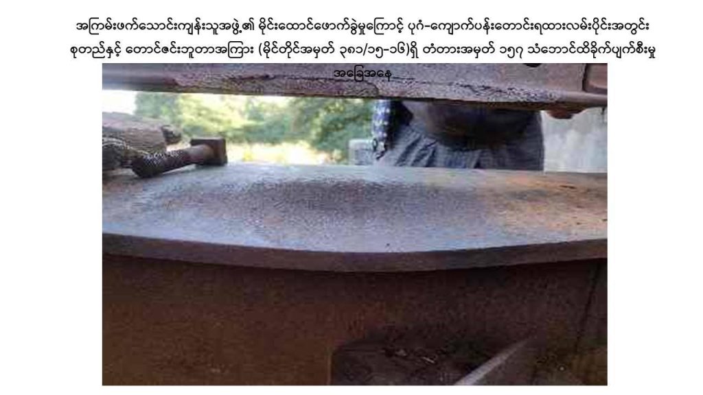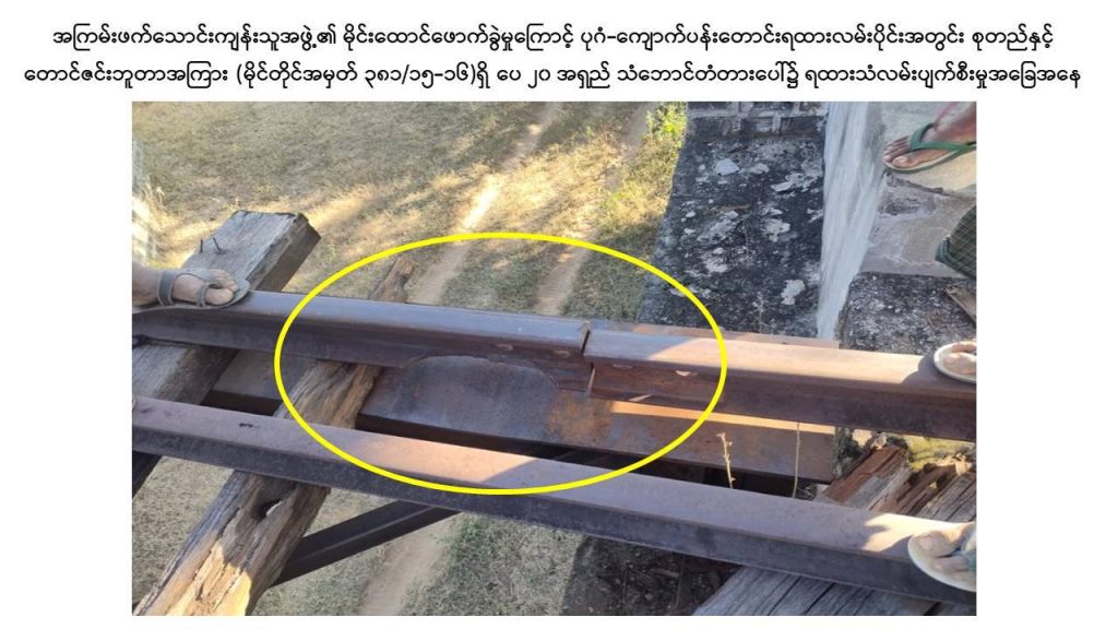မကွေးတိုင်းဒေသကြီး၊ ညောင်ဦးမြို့နယ်၊ ပုဂံ- ကျောက်ပန်းတောင်းလမ်းပိုင်းအတွင်း စုတည်ဘူတာနှင့် တောင်ဇင်းဘူတာအကြား သံလမ်းပြေးယာဉ် RGC 103 ဖြင့် ရထားလမ်းပိုင်းအား ယနေ့နံနက် ၈ နာရီ ၅၀ မိနစ်ခန့်တွင် သွားရောက်စစ်ဆေးစဉ် မိုင်တိုင် ၃၈၁/၁၅-၁၆ ကြား ပေ ၂၀ အရှည်ရှိ သံဘောင်တံတားအမှတ် ၁၅၇ အနီးတွင် အကြမ်းဖက်သောင်းကျန်းသူအဖွဲ့က မိုင်းထောင်ဖောက်ခွဲဖျက်ဆီးခဲ့သဖြင့် ရထားသံလမ်းအရှေ့ဘက်ခြမ်း သံလမ်းဖိနပ် ၁ ပေခန့် ပဲ့ထွက်ပျက်စီးခြင်းနှင့် ဇလီဖား(၃)တုံး ကျိုးပဲ့နေကြောင်းတွေ့ရှိရသဖြင့် စုတည်-တောင်ဇင်း ရထားလမ်းပိုင်းအား နံနက် ၁၀ နာရီ ၁၆ မိနစ်ခန့်တွင် ယာယီပိတ်ထားခဲ့ကြောင်း သိရှိရသည်။