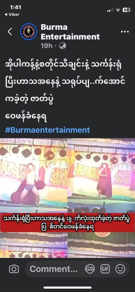 အဆိုပါ Burma Entertainment Facebook Page က ဖော်ပြထားတဲ့ သင်္ကန်းခြုံပြီး ဟာသလုပ် က,ပြခဲ့ တဲ့ ဇာတ်အဖွဲ့ကို ဘာသာ၊ သာသနာ ညှိုးနွမ်းစေတဲ့ ပြုမူတင်ဆက်မှုကို ပြင်းထန်စွာ ကန့်ကွက်ရှုတ်ချပြီး ဒီ ဇာတ်အဖွဲရဲ့ အမည်၊ တည်ထောင်သူနဲ့ တည်နေရာတို့ကို သေချာစုံစမ်းလျက်ရှိပြီးတော့ သဘင့် စည်းမျဉ်းစည်းကမ်းတွေနဲ့အညီသူ တာဝန်ရှိသူတွေကို အမြန်ဆုံး အရေးယူဆောင်ရွက်သွားမှာဖြစ်တယ်လို့ သိရပါတယ်။