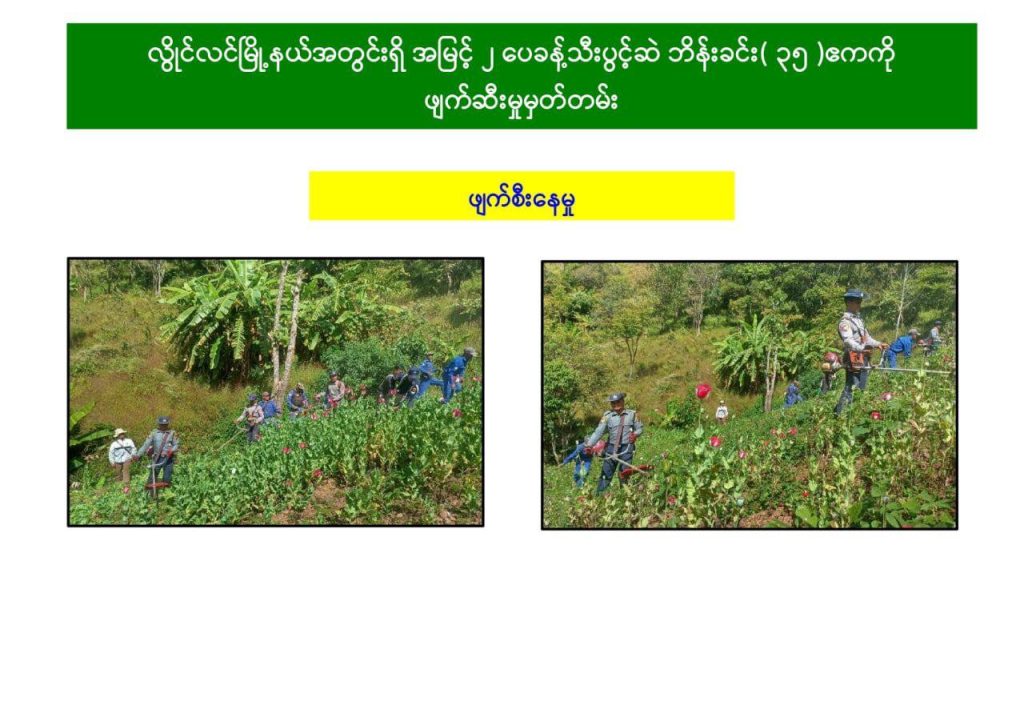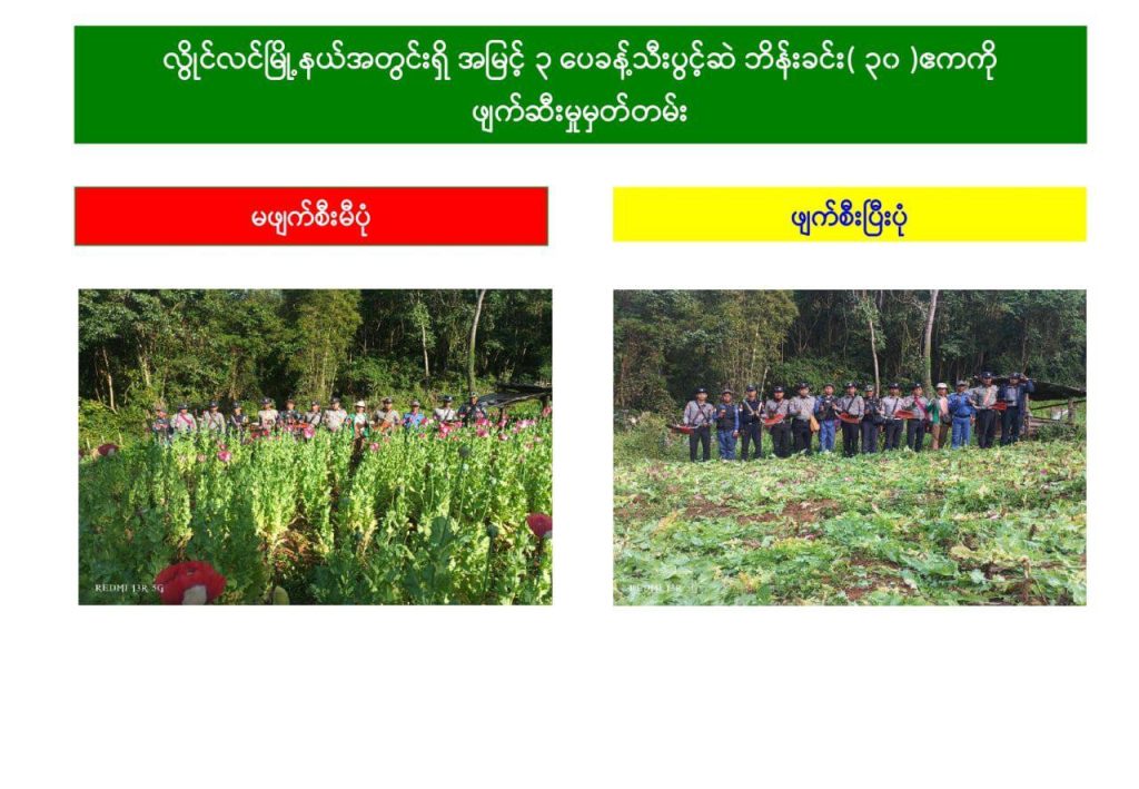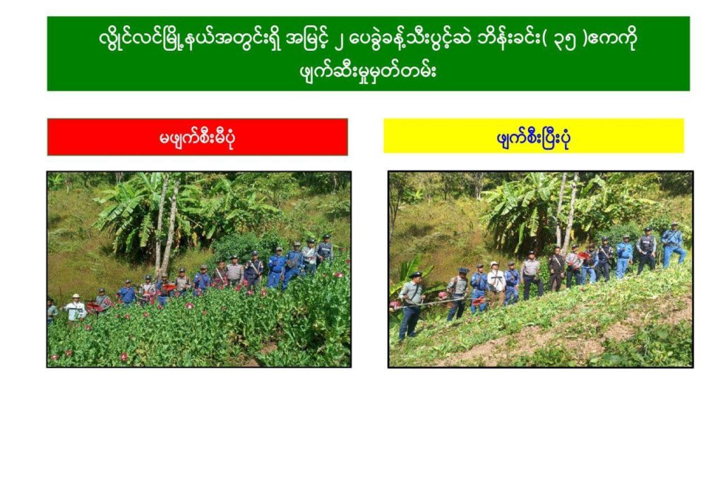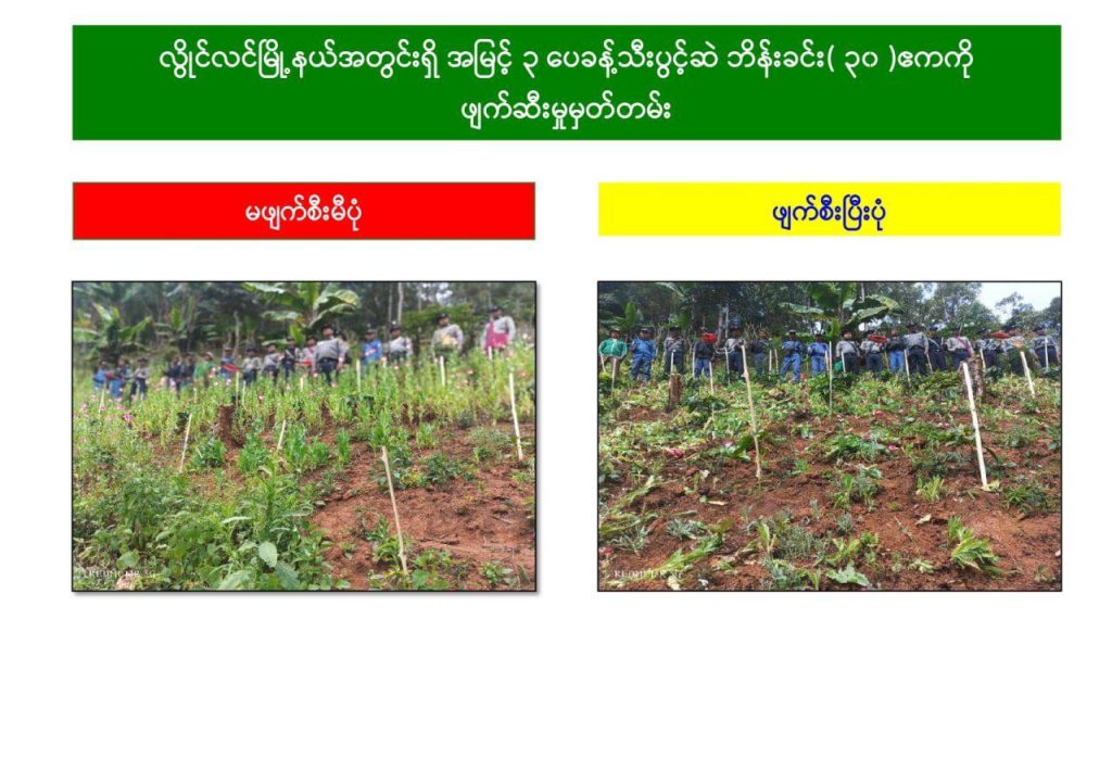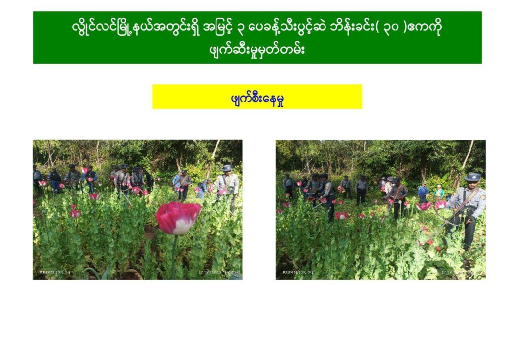 ထိုသို့ ဆောင်ရွက်လျက်ရှိရာ တပ်မတော်သားများ၊ မြန်မာနိုင်ငံရဲတပ်ဖွဲ့၊ အထွေထွေ အုပ်ချုပ်ရေးဦးစီးဌာန၊ သစ်တောဦးစီးဌာန၊ လယ်ယာမြေစီမံခန့်ခွဲရေးနှင့် စာရင်းအင်းဦးစီး ဌာနတို့အပါအဝင် ဆက်စပ်ဦးစီးဌာနများပါဝင်သော ပူးပေါင်းအဖွဲ့များ၊ နယ်မြေခံ ပြည်သူ့စစ်အဖွဲ့ဝင်များနှင့် ဒေသခံတိုင်းရင်းသားပြည်သူများပါဝင်သော ပူးပေါင်းအဖွဲ့ သည် ဒီဇင်ဘာ ၉ ရက်နှင့် ၁၀ ရက်တို့တွင် ရှမ်းပြည်နယ်(တောင်ပိုင်း)၊ လွိုင်လင်မြို့နယ်၊ ဆင်ခြေဖုံးကျေးရွာအုပ်စု၊ လုံအောင်ကျေးရွာ၏ အနောက်တောင်ဘက် ၂ မိုင်ခန့် အကွာရှိ အမြင့် ၂ ပေခွဲ သီးပွင့်ဆဲ ဘိန်းခင်း ၃၅ ဧကအား လည်းကောင်း၊ စံဖူးကျေးရွာ၏ အနောက်တောင်ဘက် ၂ မိုင်ခန့်အကွာရှိ အမြင့် ၃ ပေခွဲ၊ သီးပွင့်ဆဲ ဘိန်းခင်း ၂၅ ဧက အားလည်းကောင်း၊ တောင်နောက်ကျေးရွာအုပ်စု၊ တောင်နောက်ကျေးရွာ၏ အနောက် တောင်ဘက် ၃ မိုင်ခန့်အကွာရှိ အမြင့် ၃ ပေ သီးပွင့်ဆဲ ဘိန်းခင်း ၃၀ ဧကနှင့် ကျေးရွာ၏ အနောက်ဘက် ၃ မိုင် ၄ ဖာလုံခန့်အကွာရှိ အမြင့် ၃ ပေ သီးပွင့်ဆဲ ဘိန်းခင်း ၂၅ ဧက အားလည်းကောင်း၊ စုစုပေါင်းဘိန်းခင်း ၁၁၅ ဧကတို့အား သွားရောက်ဖျက်ဆီးခဲ့ကြောင်းနှင့် ဘိန်းခင်း ဖျက်ဆီးမှုများကို ဆက်လက်ဆောင်ရွက်သွားမည်ဖြစ်ကြောင်း သတင်းရရှိသည်။