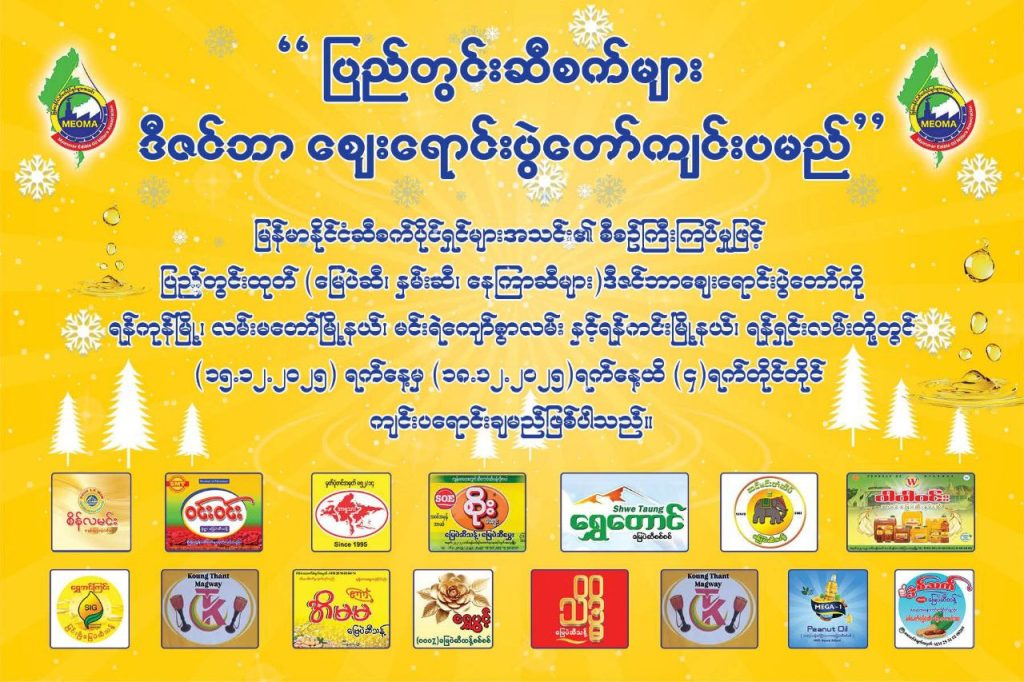 မြန်မာနိုင်ငံဆီစက်ပိုင်ရှင်များအသင်း၏ စီစဉ်ကြီးကြပ်မှုဖြင့် ပြည်တွင်းထုတ် မြေပဲဆီ၊ နှမ်းဆီ၊ နေကြာဆီများကို ဒီဇင်ဘာဈေးရောင်းပွဲတော်ကို ရန်ကုန်မြို့၊ လမ်းမတော်မြို့နယ်၊ မင်းရဲကျော်စွာလမ်းနှင့် ရန်ကင်းမြို့နယ်၊ ရန်ရှင်းလမ်းတို့တွင် ရောင်းချပေးသွားမည်ဖြစ်သည်။