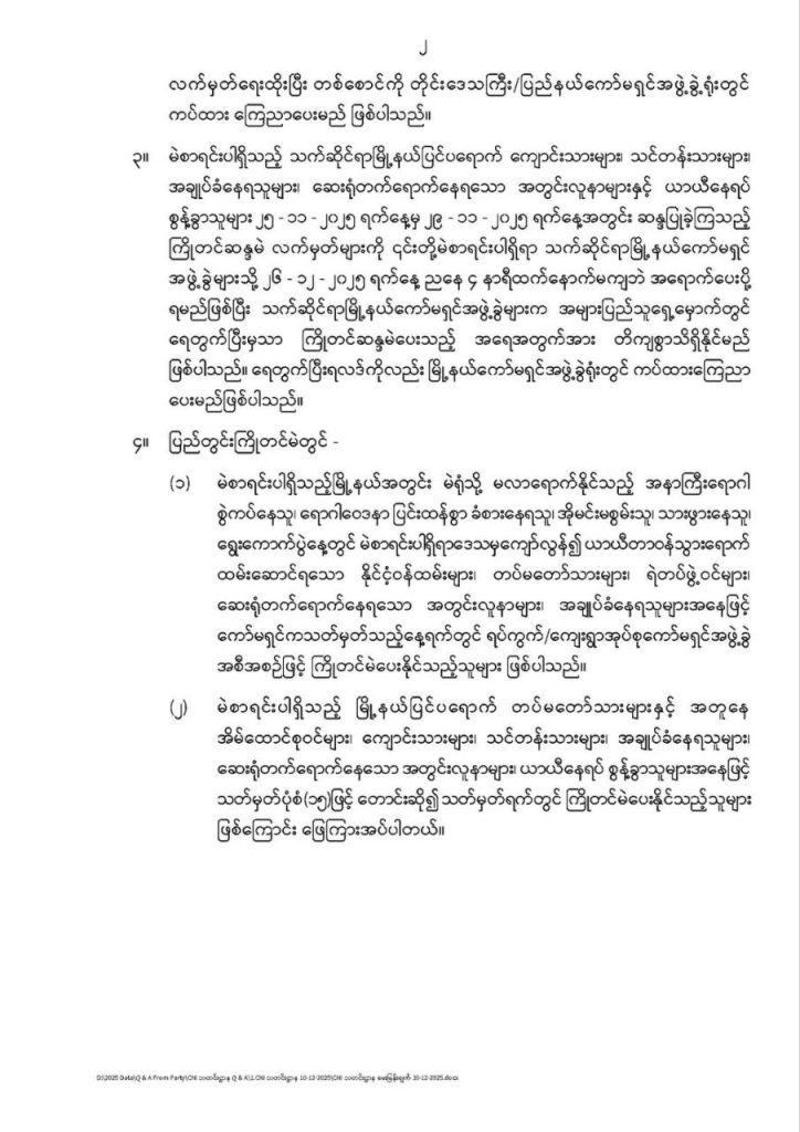 မဲစာရင်းပါရှိသည့် သက်ဆိုင်ရာမြို့နယ် ပြင်ပရောက် ကျောင်းသားများ၊ သင်တန်းသားများ၊ အချုပ်ခံနေရသူများ၊ ဆေးရုံတက်ရောက်နေရသော အတွင်းလူနာများနှင့် ယာယီနေရပ် စွန့်ခွာသူများ ၂၀၂၅ ခုနှစ် နိုဝင်ဘာလ ၂၅ ရက်မှ ၂၉ ရက်နေ့အတွင်း ဆန္ဒပြုခဲ့ကြသည့် ကြိုတင်ဆန္ဒမဲ လက်မှတ်များကို ၎င်းတို့ မဲစာရင်းပါရှိရာ သက်ဆိုင်ရာ မြို့နယ်ကော်မရှင်အဖွဲ့ခွဲများသို့ ၂၀၂၅ ခုနှစ် ဒီဇင်ဘာလ ၂၆ ရက်နေ့ ညနေ ၄ နာရီထက် နောက်မကျဘဲ အရောက်ပေးပို့ ရမည်ဖြစ်သည်။