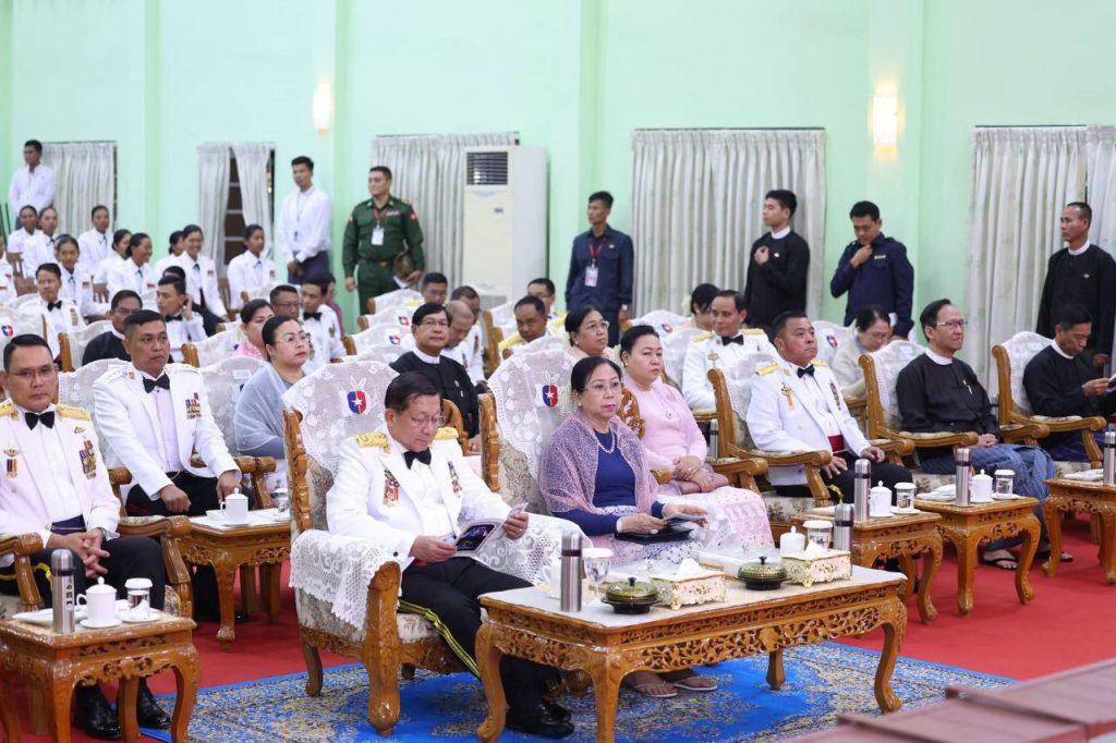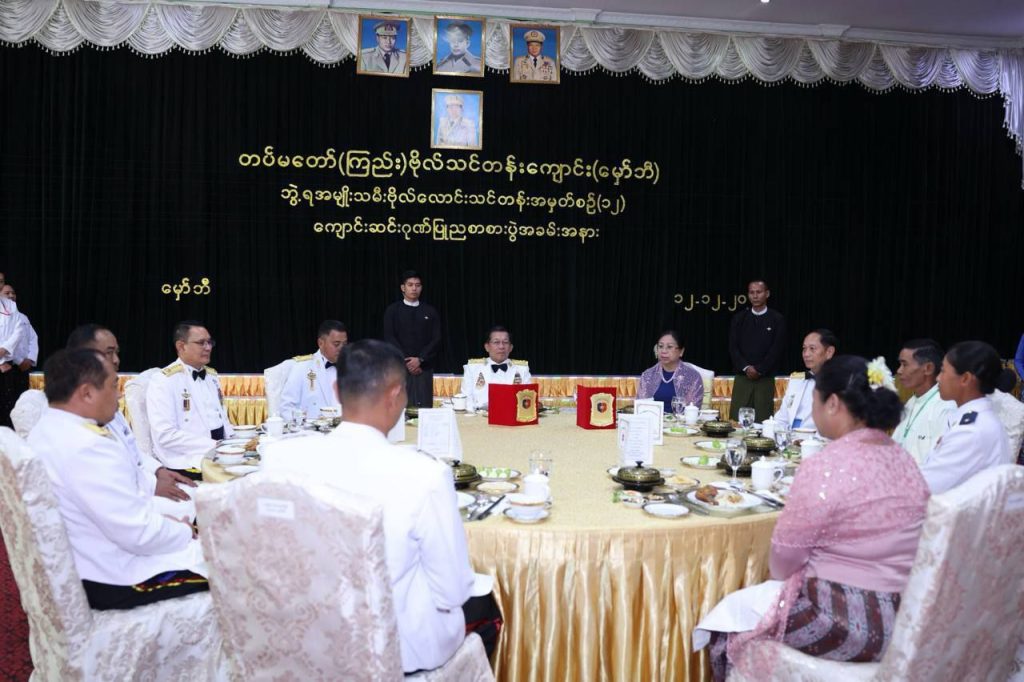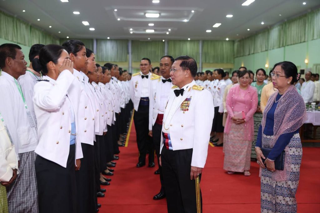 တပ်မတော်(ကြည်း) ဗိုလ်သင်တန်းကျောင်း(မှော်ဘီ)၊ ဘွဲ့ရအမျိုးသမီး ဗိုလ်လောင်း သင်တန်းအမှတ်စဉ် (၁၂) သင်တန်းဆင်း ဂုဏ်ပြုညစာစားပွဲအခမ်းအနားကို ယနေ့ ညနေပိုင်းတွင် ရန်ကုန်မြို့၊ တပ်မတော် (ကြည်း) ဗိုလ်သင်တန်းကျောင်း(မှော်ဘီ)ရှိ ပြည်ထောင်စုခန်းမ၌ ကျင်းပရာ နိုင်ငံတော်လုံခြုံရေးနှင့် အေးချမ်းသာယာရေးကော်မရှင် ဥက္ကဋ္ဌ တပ်မတော်ကာကွယ်ရေးဦးစီးချုပ် ဗိုလ်ချုပ်မှူးကြီး မင်းအောင်လှိုင် တက်ရောက်ချီးမြှင့်သည်။