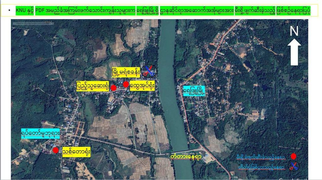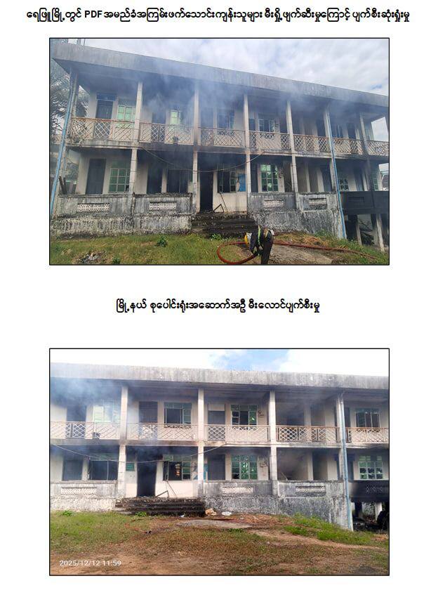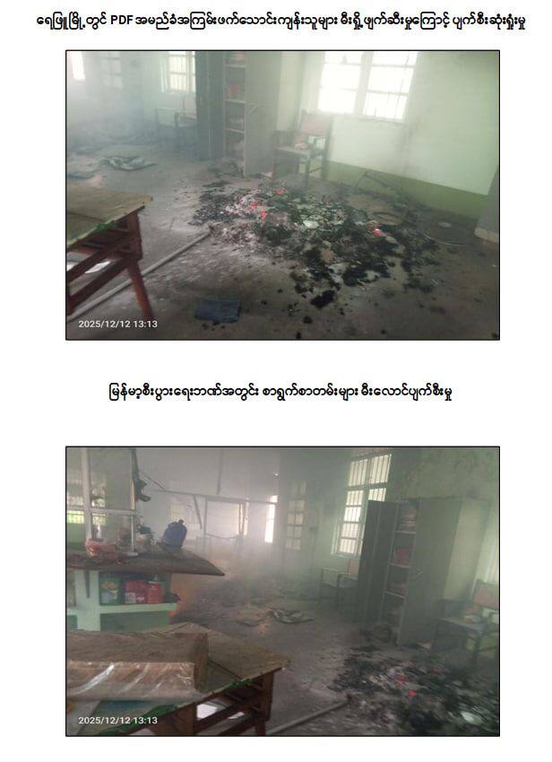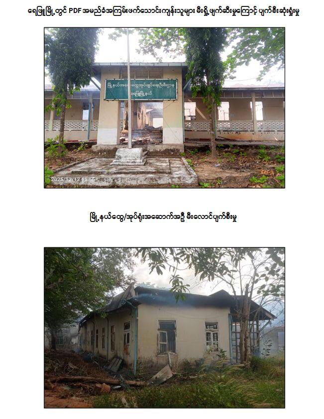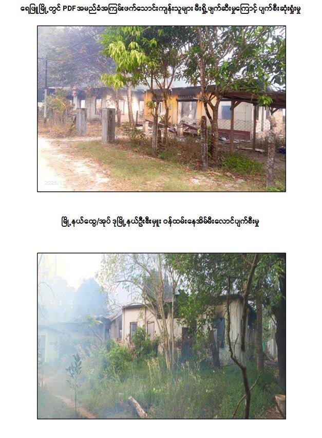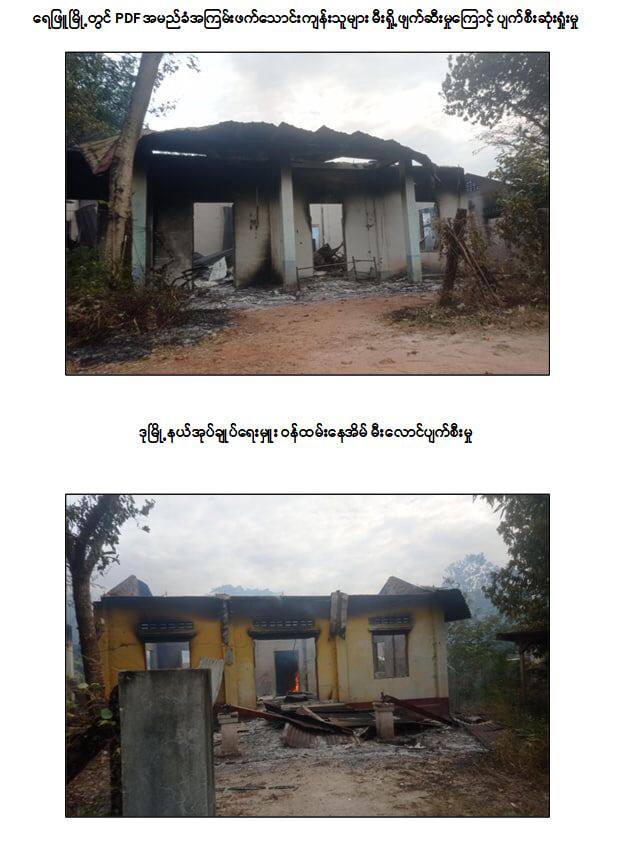 အထက်ပါ PDF များ မီးရှို့ဖျက်ဆီးခဲ့မှုကြောင့် ဌာနဆိုင်ရာ ရုံးအဆောက်အအုံများ၊ ရုံးသုံးပရိဘောဂပစ္စည်းများနှင့် အရေးကြီးစာရွက်၊ စာတမ်းများ မီးလောင်ပျက်စီးခဲ့သဖြင့် လုံခြုံရေးတပ်ဖွဲ့ဝင်များနှင့် ဒေသခံ ပြည်သူများ ပူးပေါင်း၍ လိုအပ်သည့် မီးငြှိမ်းသတ်ရေးလုပ်ငန်းစဉ်များ ဆောင်ရွက်လျက်ရှိပြီး လုံခြုံ ရေးတပ်ဖွဲ့ဝင်များက အဆိုပါ ဆုတ်ခွာ ထွက်ပြေးသွားခဲ့သည့် PDF