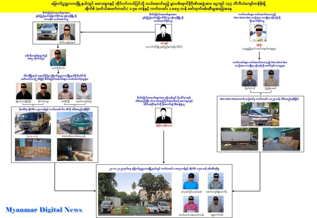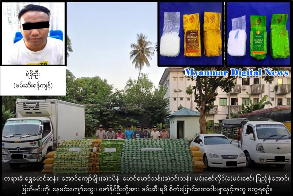 ကွင်းဆက်ဖော်ထုတ် စစ်ဆေးချက်များအရ ရှမ်းပြည်နယ်(မြောက်ပိုင်း)၊ လောက်ကိုင်မြို့နေ အားချန်(ဖမ်းဆီးရန်ကျန်)၊ ကိုစိုင်း (ခ) စိုင်းလေး (ဖမ်းဆီးရန်ကျန်)နှင့် မကွေးတိုင်းဒေသကြီး၊ ပခုက္ကူမြို့နယ်၊ ဖောင်းချောင်းကျေးရွာနေ ရဲစိုးဦး(ဖမ်းဆီးရန်ကျန်)တို့၏ အစီအမံဖြင့် ရှမ်းပြည်နယ်(မြောက်ပိုင်း)မှ စိတ်ပြောင်းဆေးဝါးများအား ရန်ကုန်မြို့သို့သယ်ဆောင်ပြီး ပင်လယ်ရေကြောင်းမှတစ်ဆင့် မလေးရှားနှင့် ထိုင်းရေပိုင်နက်သို့ သယ်ဆောင်ရောင်းဝယ် ခြင်းဖြစ်ကြောင်း သိရှိရသဖြင့် ဖမ်းဆီးရမိသည့် မူးယစ်မှောင်ခိုဂိုဏ်းအဖွဲ့ကို မူးယစ်ဆေးဝါး နှင့် စိတ်ကိုပြောင်းလဲစေသော ဆေးဝါးများဆိုင်ရာဥပဒေအရ အရေးယူထားရှိပြီး ကွင်းဆက် ပြစ်မှုကျူးလွန်သူများကို ဆက်လက်ဖော်ထုတ်လျက်ရှိကြောင်းနှင့် ၎င်းတို့၏ မူးယစ်ဆေးဝါး သယ်ဆောင်ရောင်းဝယ်ရာမှရရှိသည့် ငွေကြေးအကျိုးအမြတ်များ၊ ပိုင်ဆိုင်မှုများကို ပြည်သူ့ ဘဏ္ဍာအဖြစ် သိမ်းဆည်းနိုင်ရေးအတွက် ငွေကြေးခဝါချမှုတိုက်ဖျက်ရေးဥပဒေဖြင့် ဆက်လက် အရေးယူဆောင်ရွက်လျက်ရှိကြောင်း သတင်းရရှိသည်။ Photo – MDN