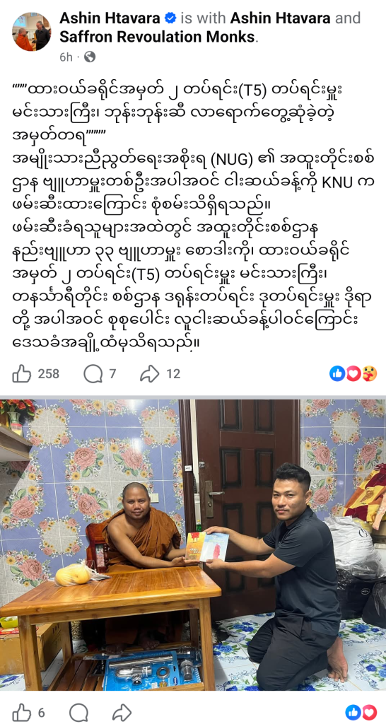 “သရက်ချောင်းမြို့နယ် KNU တပ်မဟာ (၄) တပ်ရင်း (၁၂) က ဖိုးသောကြာ/ထူးကပေါ် နဲ့ တာဝန်ရှိသူများခင်ဗျား – T5 ခေါင်းဆောင် တပ်ရင်းမှူး ကိုမင်းသားကြီး၊ ဗျူဟာ (၃၃) တပ်ရင်မှူး ကိုဘိတ် (ခ) စောဒါးကို အပါအဝင် ရဲဘော် (၄၀) ခန့်နှင့် ပလဖ ခေါင်းဆောင်အချို့ကို ချွင်းချက်မရှိ ချက်ချင်းလွှတ်ပေးဖို့ တောင်းဆိုပါတယ်။(သတ်ပုံမူရင်း)”လို့ PDF ထောက်ပို့ Ko Lay က လူမှုကွန်ရက်မှာ တောင်းဆိုထားပါတယ်။