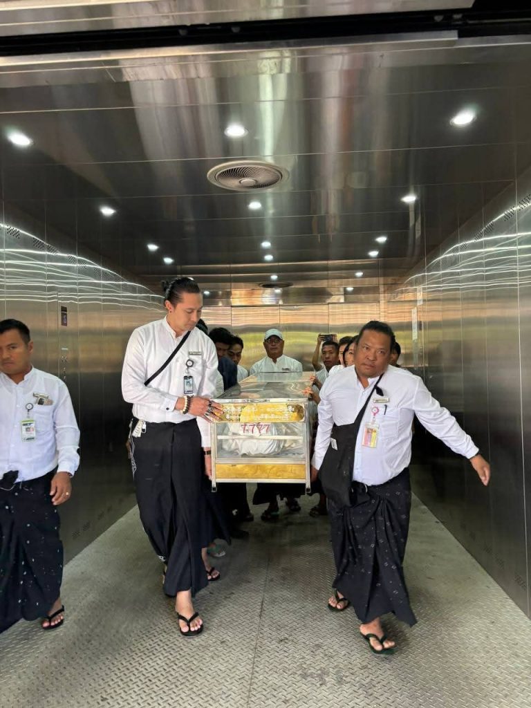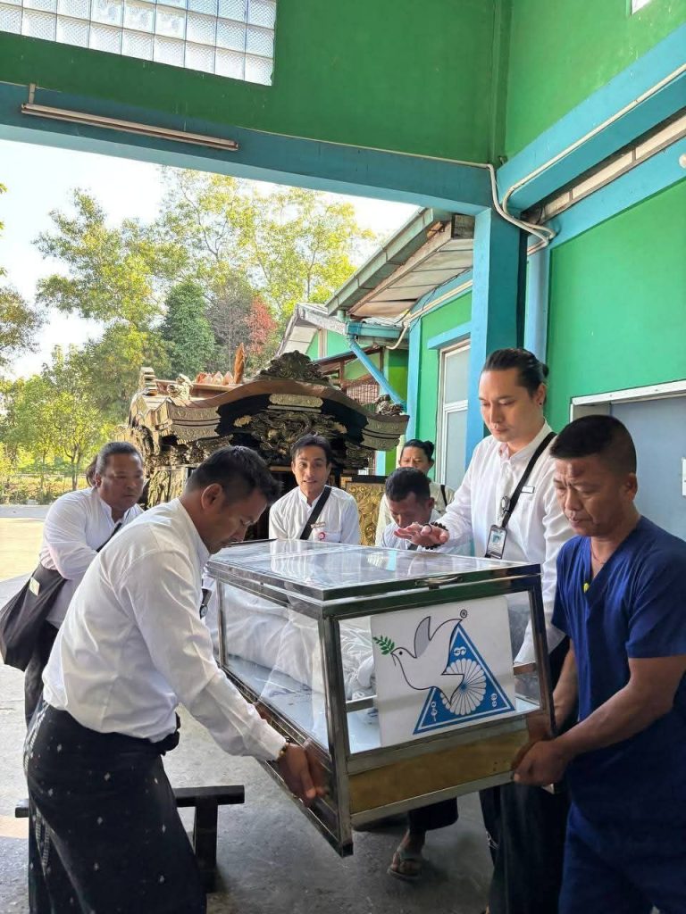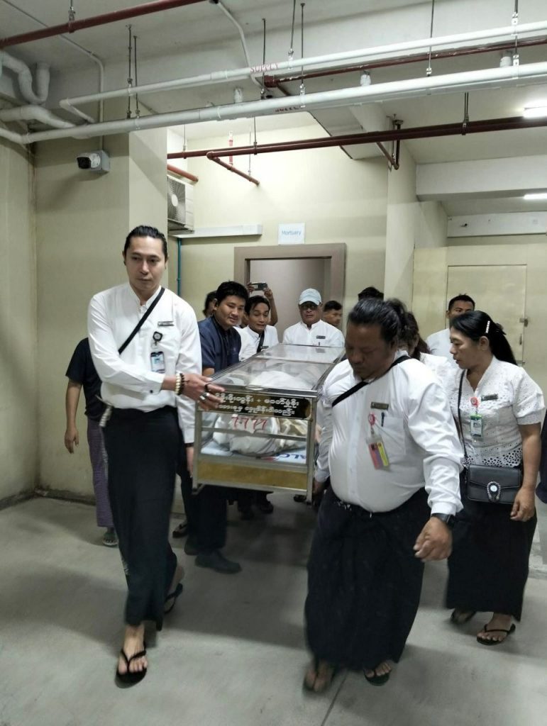 သူ့ရဲ့ရုပ်ကလာပ်ကို မြောက်ဥက္ကလာ OSC ဆေးရုံကနေ ရေဝေးသုသာန်အအေးခန်းဆီ နာရေးကူညီမှုအသင်း (ရန်ကုန်) က ရုပ်ရှင်သရုပ်ဆောင်ထွန်းကိုကိုနဲ့အတူ အသင်းသူ/သားတွေက ပို့ဆောင်ကူညီပေးခဲ့တာလည်းဖြစ်ပါတယ်။