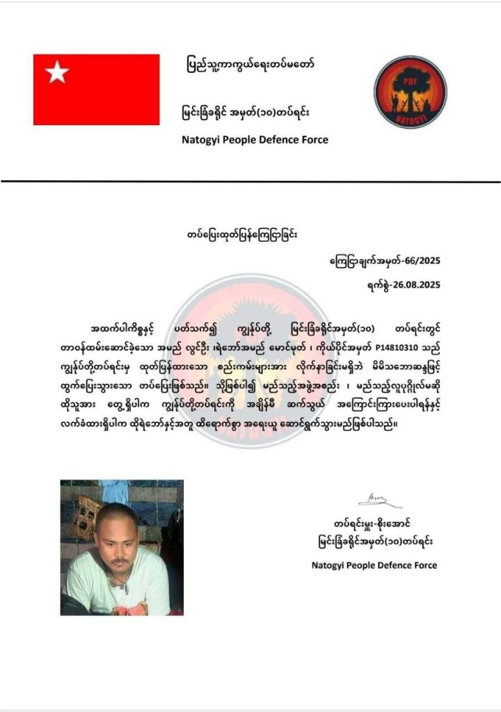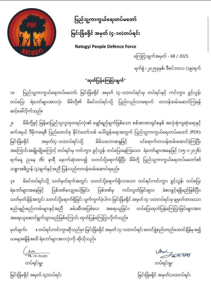 မြင်းခြံ PDF တပ်ရင်းနှစ်ခုဖြစ်သော မြင်းခြံခရိုင် အမှတ် ၄ နှင့် အမှတ် ၁၀ တပ်ရင်းမှ တပ်ရင်းနှင့် ကင်းကွာ၊ ခွင့်လွန်၊ တပ်ပြေး PDF အားလုံး မိမိတို့၏ မိခင်တပ်ရင်းသို့ ပြည်လည်လာရောက် တာဝန်ထမ်းဆောင်ကြရန် ဆင့်ခေါ်စာတွင် ပြည်သူ့ကာကွယ်ရေးတပ်မတော် (PDF)၊ မြင်းခြံခရိုင် အမှတ် ၄၊ ၁၀ တပ်ရင်းသို့ မိမိသဘောဆန္ဒဖြင့် ဝင်ရောက်တာဝန်ထမ်းဆောင်ခဲ့ကြပြီး အကြောင်းအမျိုးမျိုးကြောင့် တပ်ရင်းမှ ကင်းကွာ၊ ခွင့်လွန်၊ တပ်ပြေးနေကြသော ရဲဘော်များအနေဖြင့် ၂၀၂၆ ခုနှစ် ဇန်နဝါရီ ၁၅ ရက်နေ့ ညနေ (၆) နာရီ နောက်ဆုံးထား၍ သတင်းပို့ရောက်ရှိပြီး မိမိတို့ ပြည်သူ့ကာကွယ်ရေးတပ်မတော်၏ သစ္စာအဓိဌာန် (၄)ချက်နှင့်အညီ ပြန်လည်တာဝန်ထမ်းဆောင်ရမည်ဟု ဆိုသည်။