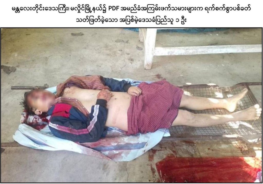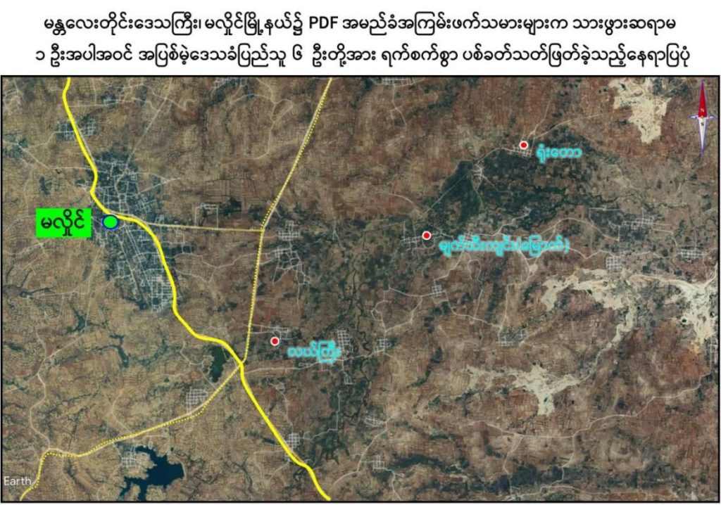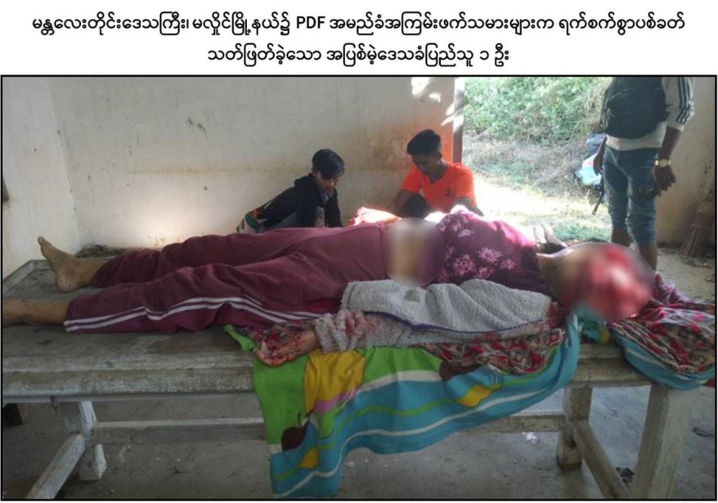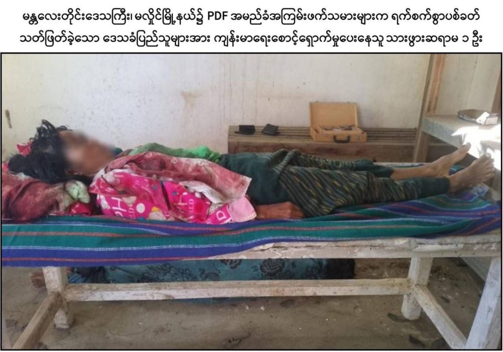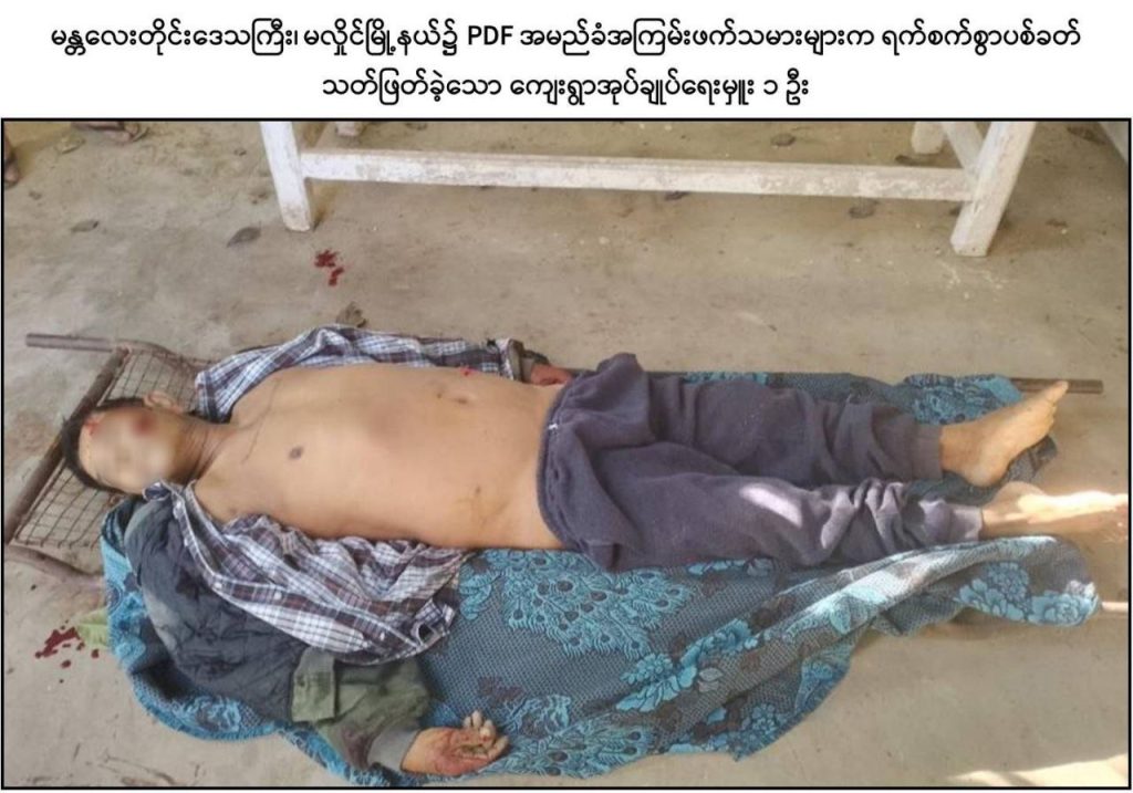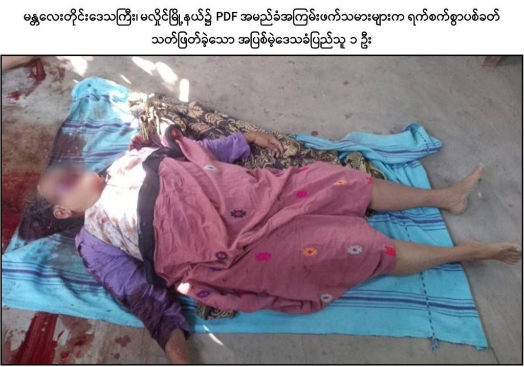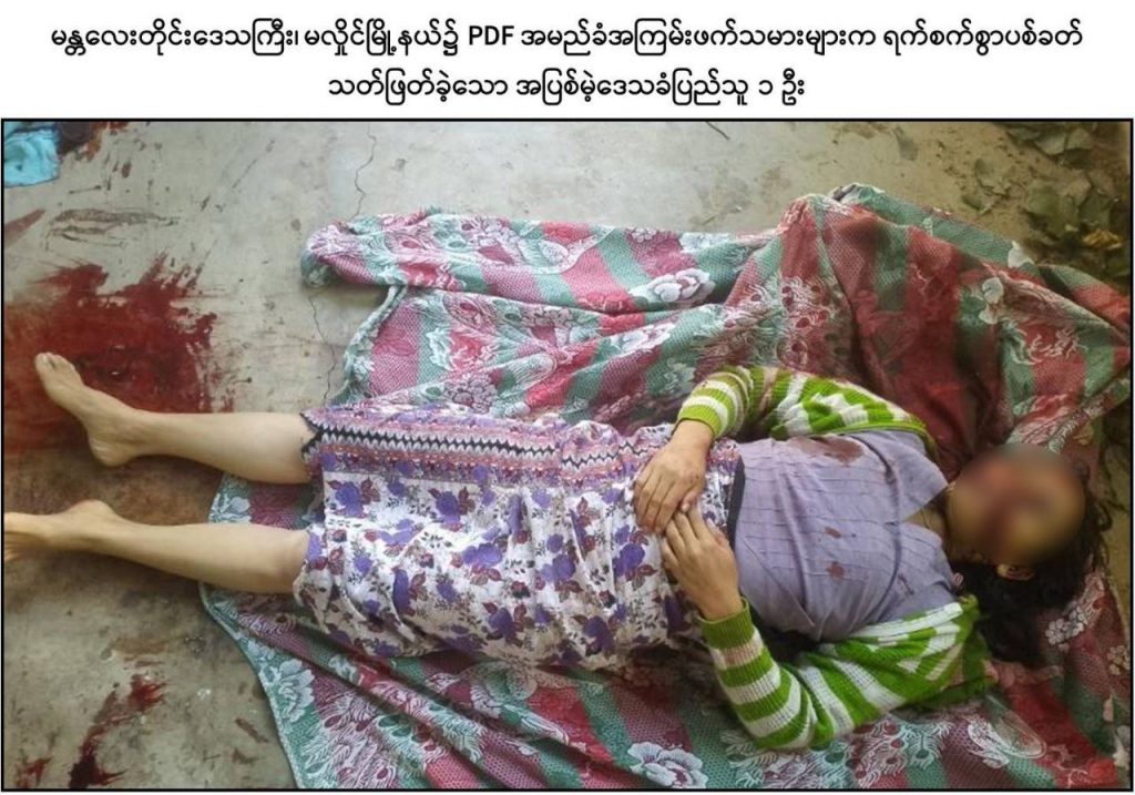 ထိုသို့ လုပ်ဆောင်လျက်ရှိရာ ဒီဇင်ဘာ ၁၉ ရက်နေ့လယ်ပိုင်းတွင် PDF အမည်ခံ အကြမ်းဖက်သမားများသည် ပြည်သူလူထုအကြား အကြောက်တရားလွှမ်းမိုးစေရန် ရည်ရွယ်၍ မန္တလေးတိုင်းဒေသကြီး၊ မလှိုင်မြို့နယ်၊ လယ်ကြီးကျေးရွာအုပ်စု၊ လယ်ကြီးကျေးရွာနေ အုပ်ချုပ်ရေးမှူး ဦးလှမင်းကြည်(ဘ)ဦးလှထူးနှင့် ၎င်း၏ဇနီးဖြစ်သူ ဒေါ်ချိုချိုမြင့်(ဘ) ဦးရွှေသောင်းတို့အားလည်းကောင်း၊ မလှိုင်မြို့နယ်၊ မျက်သီးကျင်း(မြောက်) ကျေးရွာနေ ကုန်စုံဆိုင်လုပ်ကိုင်သူ ဒေါ်လှရှင်း (ဘ) ဦးမွှေး၊ ဒေါ်ယဉ်ယဉ်အောင် (ဘ) ဦးညွန့်ရွှေနှင့် ဦးမိုးသူ(ခ)တရုတ်ကြီး (ဘ)ဦးညွန့်ရွှေတို့အားလည်းကောင်း၊ မလှိုင်မြို့နယ်၊ ရုံးတောကျေးရွာ၊ ကျေးလက်ကျန်းမာရေးဌာနမှ ဒေသခံပြည်သူများအား ကျန်းမာရေး စောင့်ရှောက်မှုပေးနေသူ သားဖွားဆရာမ ဒေါ်အေးအေးခိုင် (ဘ) ဦးကျော်ဝင်းအား လည်းကောင်း ၎င်းတို့နေအိမ်အသီးသီး၌ရှိနေစဉ် PDF များက လက်နက်ငယ်များဖြင့် လာရောက်၍ ယုတ်မာရိုင်းစိုင်းစွာ ဝိုင်းဝန်းပစ်ခတ်ခဲ့သဖြင့် သားဖွားဆရာမဖြစ်သူ ဒေါ်အေးအေးခိုင်အပါအဝင် အပြစ်မဲ့ဒေသခံပြည်သူ ၆ ဦးတို့သည် ကျည်ထိမှန်ဒဏ်ရာများဖြင့် ၎င်းတို့နေအိမ်အသီးသီး၌ပင် သေဆုံးသွားခဲ့ကြောင်း သိရှိရသည်။