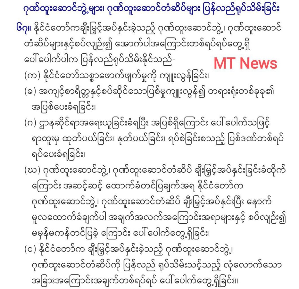 နိုင်ငံတော်က ချီးမြှင့်အပ်နှင်းခဲ့သည့် ဂုဏ်ထူးဆောင်ဘွဲ့၊ ဂုဏ်ထူးဆောင် တံဆိပ်များ ပြန်လည်ရုပ်သိမ်းခြင်း ပြဋ္ဌာန်းချက်အပိုဒ် ၆၇ သည် (က) နိုင်ငံတော်သစ္စာဖောက်ဖျက်မှုကို ကျူးလွန်ခြင်း၊ (ခ) အကျင့်စာရိတ္တနှင့်စပ်ဆိုင်သောပြစ်မှုကျူးလွန်၍ တရားရုံးတစ်ခုခု၏ အပြစ်ပေးခံရခြင်း၊ (ဂ) ဌာနဆိုင်ရာအရေးယူခြင်းခံရပြီး အပြစ်ရှိကြောင်း ပေါ်ပေါက်သဖြင့် ရာထူးမှ ထုတ်ပယ်ခြင်း၊ နုတ်ပယ်ခြင်း၊ ရပ်စဲခြင်းစသည့် ပြစ်ဒဏ်တစ်ရပ် ရပ်ပေးခံရခြင်း၊ (ဃ) ဂုဏ်ထူးဆောင်ဘွဲ့၊ ဂုဏ်ထူးဆောင်တံဆိပ် ချီးမြှင့်အပ်နှင်းခြင်းခံထိုက်ကြောင်း အဆင့်ဆင့် ထောက်ခံတင်ပြချက်အရ နိုင်ငံတော်က ဂုဏ်ထူးဆောင်ဘွဲ့၊ ဂုဏ်ထူးဆောင်တံဆိပ် ချီးမြှင့်အပ်နှင်းပြီးနောက် မူလထောက်ခံချက်ပါ အချက်အလက်အကြောင်းအရာများနှင့် စပ်လျဉ်း၍ မမှန်မကန်တင်ပြခဲ့ကြောင်း ပေါ်ပေါက်တွေ့ရှိခြင်း၊ (င) နိုင်ငံတော်က ချီးမြှင့်အပ်နှင်းခဲ့သည့် ဂုဏ်ထူးဆောင်ဘွဲ့၊ ဂုဏ်ထူးဆောင်တံဆိပ်ကို ပြန်လည် ရုပ်သိမ်းသင့်သည့် လုံလောက်သော အခြားအကြောင်း အချက်တစ်ရပ်ရပ် ပေါ်ပေါက်တွေ့ရှိခြင်း စသည်ဖြင့် ပြဋ္ဌာန်းထားသည်ဟုလည်း သိရသည်။