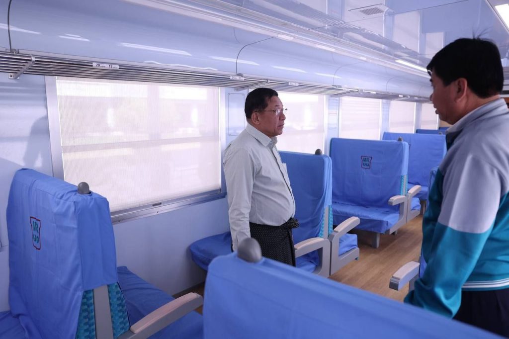 ယာယီသမ္မတနှင့် အဖွဲ့ဝင်များ နေပြည်တော်ဘူတာကြီးသို့ ရောက်ရှိစဉ် တာဝန်ရှိသူများက ကြိုဆိုနှုတ်ဆက်ကြပြီးနောက် ယာယီသမ္မတက နေပြည်တော်မှ ရန်ကုန်သို ထွက်ခွာမည့် ဒီဇယ်လျှပ်စစ်သုံး (DEMU)အစုန်ရထား ဘူတာရုံ၌ ဆိုက်ကပ်ထားရှိမှုနှင့် ဘူတာရုံအတွင်း လှည့်လည်ကြည့် ရှုစစ်ဆေးခဲ့သည်။