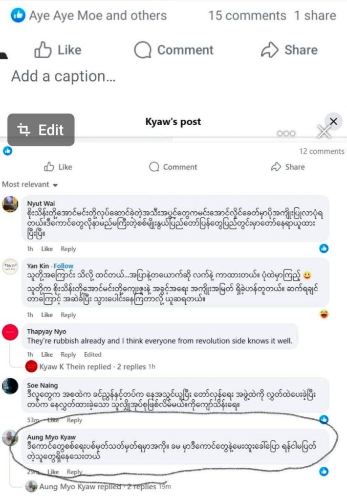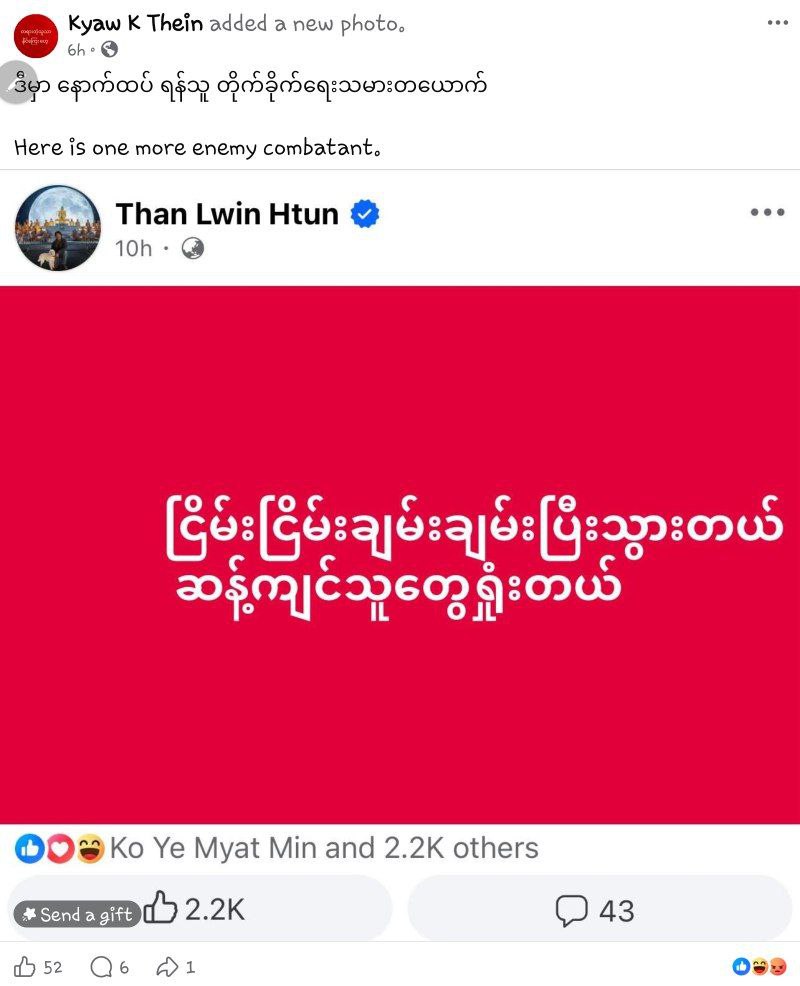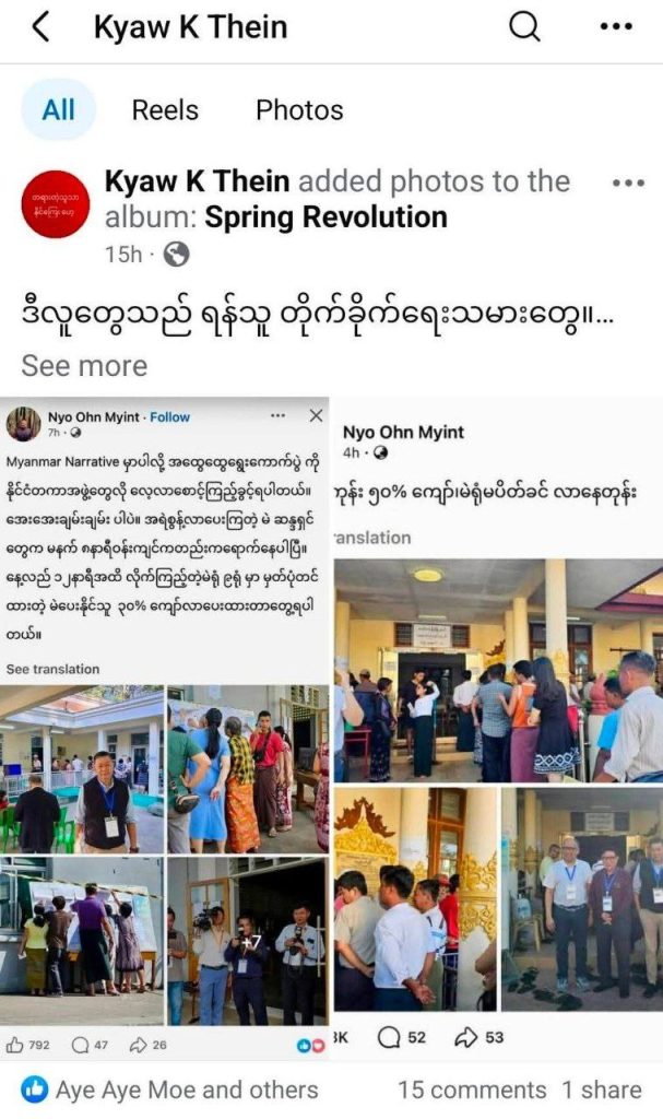 ယမန်နေ့က ရွေးကောက်ပွဲကျင်းပနေသည်များကို ဦးညိုအုန်းမြင့်က လွတ်လပ်မျှတမှုမရှိ နိုင်ငံတကာအဖွဲ့အစည်းများနည်းတူ စောင့်ကြည့်လေ့လာခဲ့ပြီးနောက် ရွေးကောက်ပွဲမှာ တရာမမျှတသည့် အခြေအနေမတွေ့ရကြောင်း ဖြေဆိုမှုများအပါအဝင် ပို့စ်များကို Facebook ပေါ် ရေးသားဖြေဆိုမှုများ ပြုလုပ်ခဲ့ရာ အဆိုပါရေးသားမှုများအနက် “Myanmar Narrative မှာပါလို့ အထွေထွေရွေးကောက်ပွဲကို နိုင်ငံတကာအဖွဲ့တွေလို လေ့လာစောင့်ကြည့်ခွင့်ရပါတယ်။ အေးအေးချမ်းချမ်းပါပဲ။ အရဲစွန့်လာပေးကြတဲ့ မဲဆန္ဒရှင်တွေက မနက် ၈ နာရီဝန်းကျင်ကတည်းက ရောက်နေပါပြီ။ နေ့လည် ၁၂ နာရီအထိ လိုက်ကြည့်တဲ့မဲရုံ ၉ ရုံမှာ မှတ်ပုံတင်ထားတဲ့ မဲပေးနိုင်သူ ၃၀% ကျော်လာပေးထားတာ တွေ့ရပါတယ်။”ဆိုသော ပို့စ်နှင့် “မရမ်းကုန်း ၅၀% ကျော်၊ မဲရုံမပိတ်ခင်လာနေတုန်း” ဆိုသည့် ပို့စ်နှစ်ခုကို NLD, NUG နှင့် PDF ထောက်ခံသည့် Kyaw K Thein ဆိုသည့် အကောင့်တစ်ခုက Screenshot ရိုက်ကာ နွေဦးတော်လှန်ရေးလုပ်သော Spring Revolution Page ကို Tag တွဲပြီး “ဒီလူတွေသည် ရန်သူတိုက်ခိုက်ရေးသမားတွေ”ဟု မျှဝေခဲ့ရာ Aung Myo Kyaw အကောင့်က “ဒီကောင်တွေ စစ်ရေးပစ်မှတ် သတ်မှတ်ရမှာ အကို။ ခမမှာ ဒီကောင်တွေနဲ့ မေးထူးခေါ်ပြော ရန်ငါမပြတ်တဲ့သူတွေ ရှိနေသေးတယ်”ဟု ပြောဆိုမှုအပါအဝင် သတ်ဖြတ်ရန် လှုံ့ဆော်မှုများ ပြုလုပ်ခဲ့သည်။