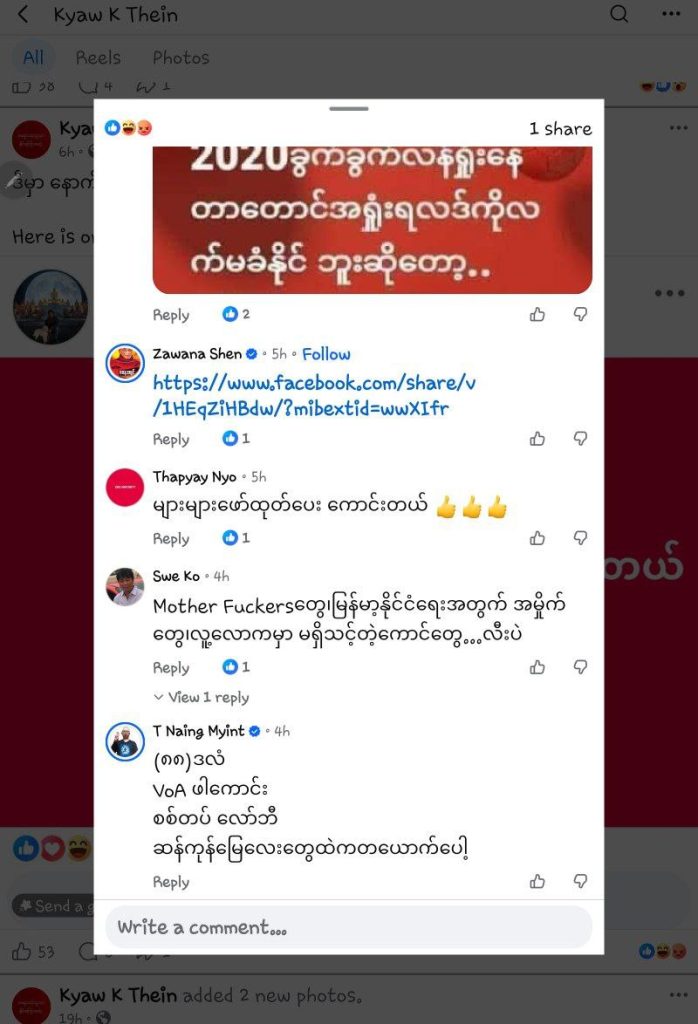 ယမန်နေ့ ဒီဇင်ဘာ ၂၈ ရက်က ကျင်းပခဲ့သော မြန်မာ့ရွေးကောက်ပွဲ ပထမပိုင်းတွင် ရွေးကောက်ပွဲစောင့်ကြည့်မှုရာ၌ ပါဝင်ခဲ့သော မြန်မာ့ပုံရိပ်ဖော်ညွှန်းရေးအဖွဲ့၏ အကြံပေး ဦးညိုအုန်းမြင့်ကို NUG နှင့် PDF ထောက်ခံပြီး ရွေးကောက်ပွဲမနှစ်မြို့သူများက သတ်ဖြတ်ရန် ခြိမ်းခြောက်နေကြသဖြင့် ဦးညိုအုန်းမြင့်က အမေရိကန်နိုင်ငံသားခံယူထားသူတချို့ကို အကြမ်းဖက်ရန် လုပ်ဆောင်နေပြီဖြစ်ကြောင်း အမေရိကန်ကောင်စစ်ဝန်ချုပ်ထံ အကြောင်းကြားရတော့မည့်ဟု တုံ့ပြန်လိုက်သည်။