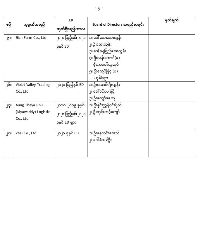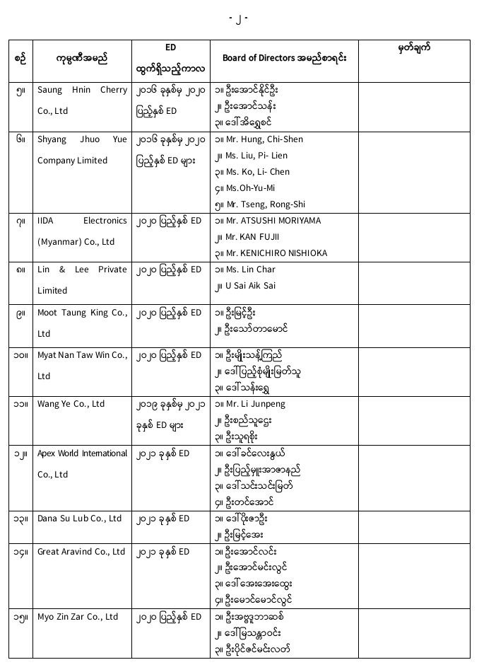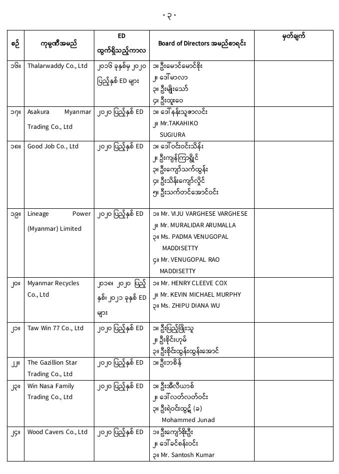 ထို့အတူ ကုမ္ပဏီနှင့် ဒါရိုက်တာအဖွဲ့ဝင်တို့အပေါ် အမည်မည်းစာရင်း (Black List) ထည့်သွင်းခြင်းနှင့် မြန်မာပြည်ဝင်/ထွက်ခွင့် တားဆီးခြင်းတို့မှ ပယ်ဖျက်ပြီးသည့်ကုမ္ပဏီ ၂၉ ခု၏ စာရင်းကိုလည်း ပူးတွဲထုတ်ပြန်ပေးထားသည်။