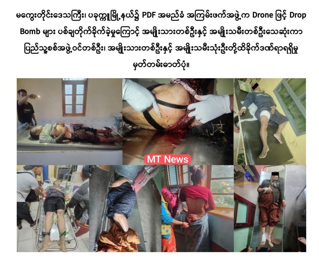 NUG ဩဇာခံ PDF များ၏ ကျူးလွန်မှုဖြစ်စဉ်မှာ ၂၀၂၆ ခုနှစ်၊ ဇန်နဝါရီ ၃ ရက် မွန်းလွဲ ၂ နာရီ ၄၅ မိနစ်တွင် မကွေးတိုင်းဒေသကြီး၊ ပခုက္ကူမြို့နယ်၊ အင်ပင်ကျေးရွာအနီး ပခုက္ကူ-မြိုင်သွားကားလမ်းပေါ်သို့ PDF များက အများပြည်သူထိခိုက်စေရန် ရည်ရွယ်၍ ပစ်ချလိုက်သည့် Drop Bomb များ ကျရောက်ပေါက်ကွဲခဲ့မှုကြောင့် အဆိုပါနေရာအနီး ဖြတ်သန်းသွားလာလျက်ရှိသည့် ခရီးသည်တင်သုံးဘီးဆိုင်ကယ်တစ်စီးအား ဗုံးသီးပေါက်ကွဲစများ ထိမှန်ခဲ့သဖြင့် ယာဉ်မောင်းဖြစ်သူ ပခုက္ကူမြို့နယ်၊ အမှတ်(၁၁)ရပ်ကွက်နေ ဦးမျိုးထွန်းဦး (၄၀) နှစ်နှင့် ယာဉ်ပေါ်တွင် လိုက်ပါလာသူများ ဖြစ်ကြသည့် အမှတ်(၁၅) ရပ်ကွက်နေ ဒေါ်ဝင်းဌေး (၅၀) နှစ်တို့တွင် ဗုံးသီးပေါက်ကွဲစထိမှန်ဒဏ်ရာများ ရရှိကာ သေဆုံးသွားခဲ့ပြီး ကျန်ခရီးသည်များဖြစ်ကြသော လယ်ယာကျေးရွာနေ ကိုခန့်ဇော် (၂၂) နှစ်၊ အမှတ်(၆)ရပ်ကွက်နေ ဒေါ်ခင်မာဌေး (၅၄) နှစ်၊ အမှတ်(၅) ရပ်ကွက်နေ ဒေါ်လှိုင်လှိုင်ဝေ (၂၉) နှစ်နှင့် ဒေါ်ထွေးတင် (၆၂) နှစ်၊ မြိုင်မြို့နယ်၊ ဝက်ပုတ်ကျေးရွာနေ ပြည်သူ့စစ်အဖွဲ့ဝင် ဦးကျော်မြင့် (၆၃) နှစ်တို့တွင် ဗုံးသီးပေါက်ကွဲစ ထိမှန်ဒဏ်ရာများ ရရှိခဲ့၍ သေဆုံး/ဒဏ်ရာရရှိသူများအား ပခုက္ကူခရိုင် ပြည်သူ့ဆေးရုံကြီးသို့ ပို့ဆောင်ထားရှိကြောင်း သိရသည်။