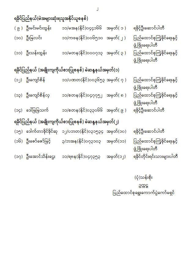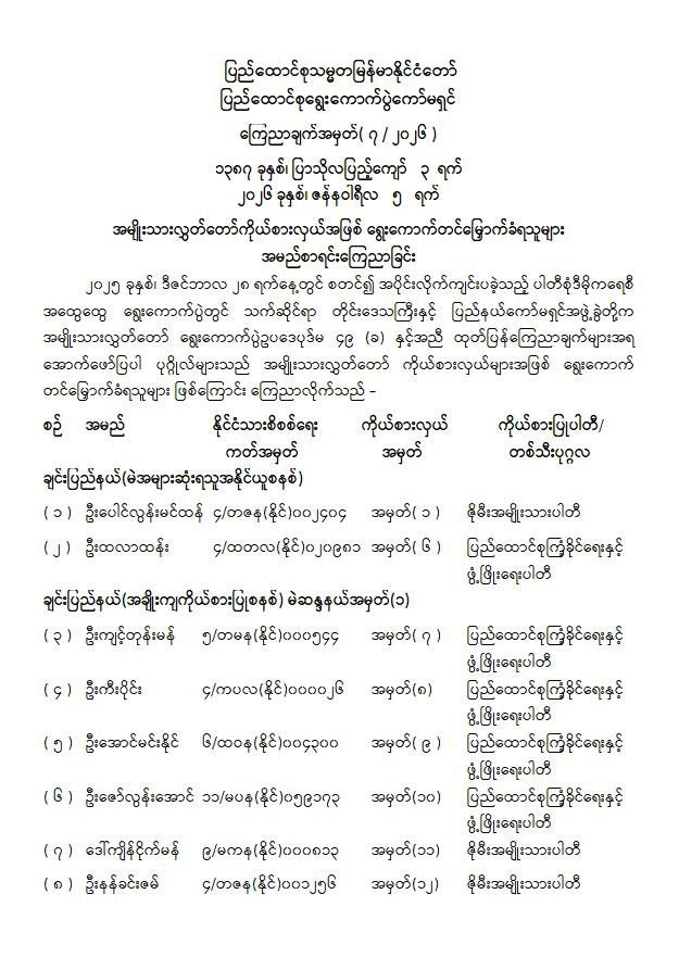 ၂၀၂၅ ပါတီစုံဒီမိုကရေစီအထွေထွေရွေးကောက်ပွဲ အပိုင်း (၁) ၌ ချင်းပြည်နယ်နှင့် ရခိုင်ပြည်နယ်တို့တွင် အနိုင်ရရှိခဲ့သည့် အမျိုးသားလွှတ်တော်ကိုယ်စားလှယ် ၁၇ ဦးအား ပြည်ထောင်စုရွေးကောက်ပွဲကော်မရှင် (UEC) က ကြေညာချက်အမှတ် (၇/၂၀၂၆) ဖြင့် ယနေ့တွင် ထုတ်ပြန်ထားသည်။
