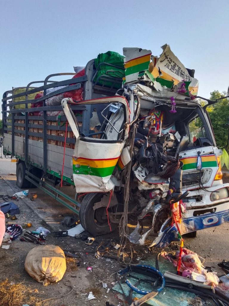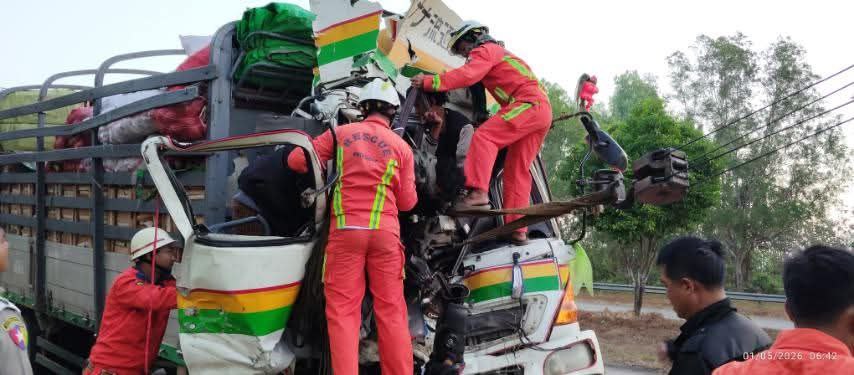 လမ်းပေါ် ဘီးတစ်ဝက်တင်ကာရပ်ထားတဲ့ ခရီးသည်တင်ယာဉ်ကို ကုန်တင်ယာဉ်တစ်စီးက အရှိန်မထိန်းနိုင်ဘဲ ဝင်တိုက်လို့ ကုန်တင်ယာဉ်မောင်း ဆေးရုံတင်ပို့ကုသစဉ် သေဆုံးခဲ့မှု အမြန်လမ်းမှာ ဖြစ်ပွားခဲ့တယ်လို့ မြန်မာနိုင်ငံ မီးသတ်တပ်ဖွဲ့ထံကနေ သိရပါတယ်။