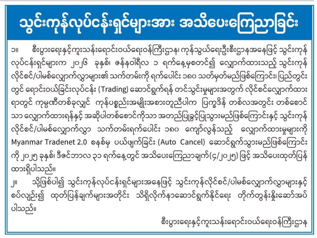 သွင်းကုန်လိုင်စင်/ပါမစ်လျှောက်လွှာ သက်တမ်းရက်ပေါင်း ၁၈၀ ကျော်လွန်သည့် လျှောက်ထားမှုများကို Myanmar Tradenet 2.0 စနစ်မှ ပယ်ဖျက်ခြင်း (Auto Cancel) ဆောင်ရွက်သွားမည်ဖြစ်ကြောင်းကို ၂၀၂၅ ခုနှစ်၊ ဒီဇင်ဘာလ ၃၁ ရက်နေ့တွင် အသိပေးကြေညာချက် (၄/၂၀၂၅) ဖြင့် အသိပေးထုတ်ပြန်ထားပြီးဖြစ်သည်။ ထို့ကြောင့် သွင်းကုန်လုပ်ငန်းရှင်များအနေဖြင့် သွင်းကုန်လိုင်စင်/ပါမစ်လျှောက်လွှာများနှင့် စပ်လျဉ်း၍ ထုတ်ပြန်ချက်များအတိုင်း သိရှိလိုက်နာဆောင်ရွက်နိုင်ရေး တိုက်တွန်းနှိုးဆော်ထားသည်။