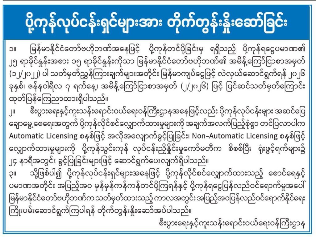 ထို့ကြောင့် ပြည်တွင်း၌ ရောင်းဝယ်ခြင်းလုပ်ငန်း (Trading) ဆောင်ရွက်ရန် တင်သွင်းမှုများအတွက် လိုင်စင်လျှောက်ထားရာတွင် ကုမ္ပဏီတစ်ခုလျှင် ကုန်ပစ္စည်းအမျိုးအစား တူညီပါက ပြက္ခဒိန်တစ်လအတွင်း တစ်စောင်သာ လျှောက်ထားရန်နှင့် အဆိုပါတစ်စောင်ကိုသာ အတည်ပြုခွင့်ပြုသွားမည်ဖြစ်ကြောင်း အသိပေးထားသည်။